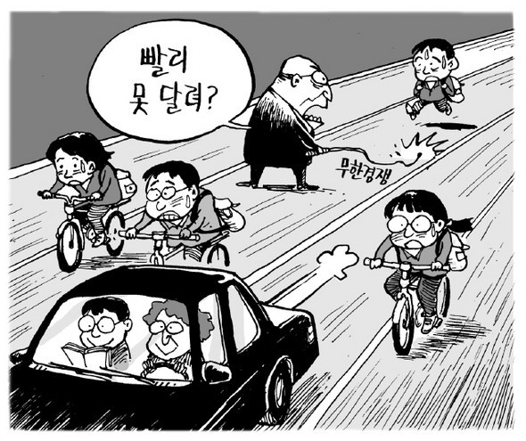 대한민국 노동자의 하루하루가 매일 새로운 시험을 치는 나날 같은데, 그 내상 덩어리의 깊이와 농도는 얼마나 더 할까. 지금껏 쌓여온 내상의 존재를 인지조차 못할지도 모른다. 더구나 그 시험은 끝도 없다. 살아야 하는 한 말이다. 시험 기간이 중간에 끝나지도 않으니깐 말이다. 마음 편히 쉴 수 있는 방학 또한 충분치 않아서 별 의미도 없어 보인다. 하나같이 다들 무한 반복의 시험 기간 속에서 시달리고 있는 수험생들 같아 보인다. 학교를 졸업해도, 공부가 끝나도, 오히려 더욱더 한국적인 지독한 수험생 기간이 또 기다리고 있을 줄 그 누가 알았을까. 우리의 수험생 시절과 별반 다르지 않다는 의미는, 여전히 엄청난 경쟁 사회라는 것이다.