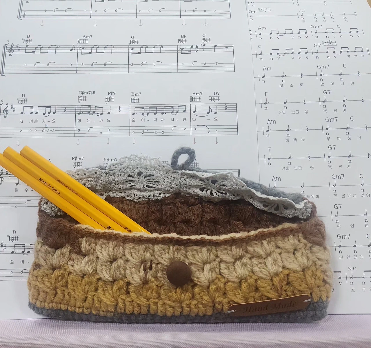 <연필이 가지런하게 들어있는 손뜨개 필통>