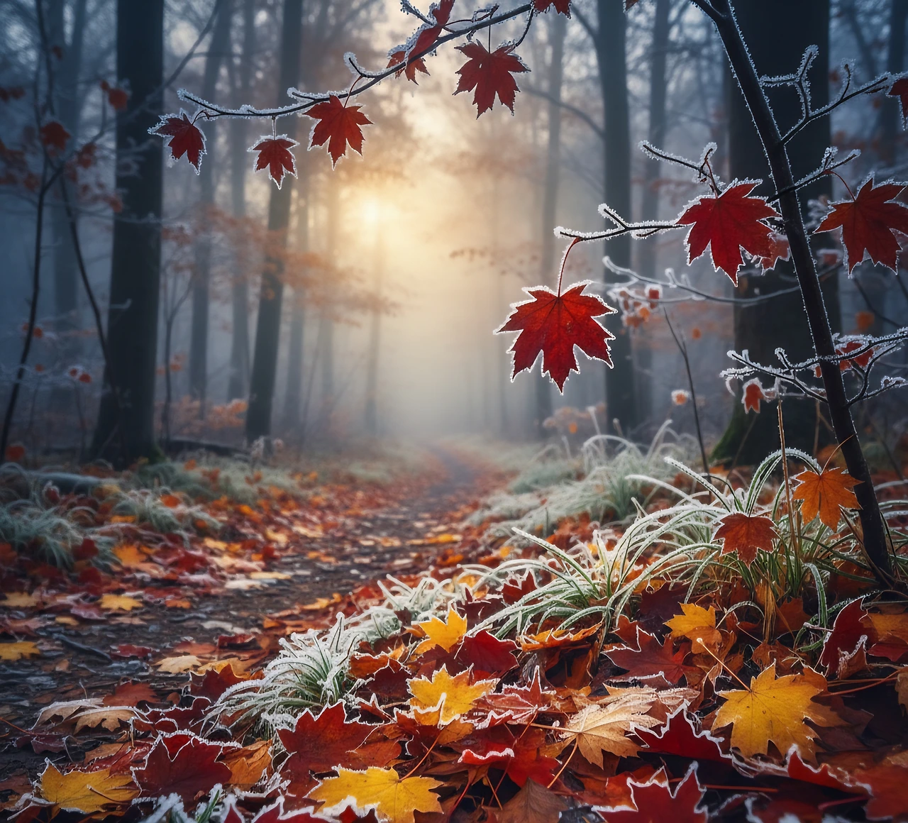 아직 매달려 있는 붉은 잎사귀 위로 차가운 서리가 하얗게 내려앉은듯한 풍경.