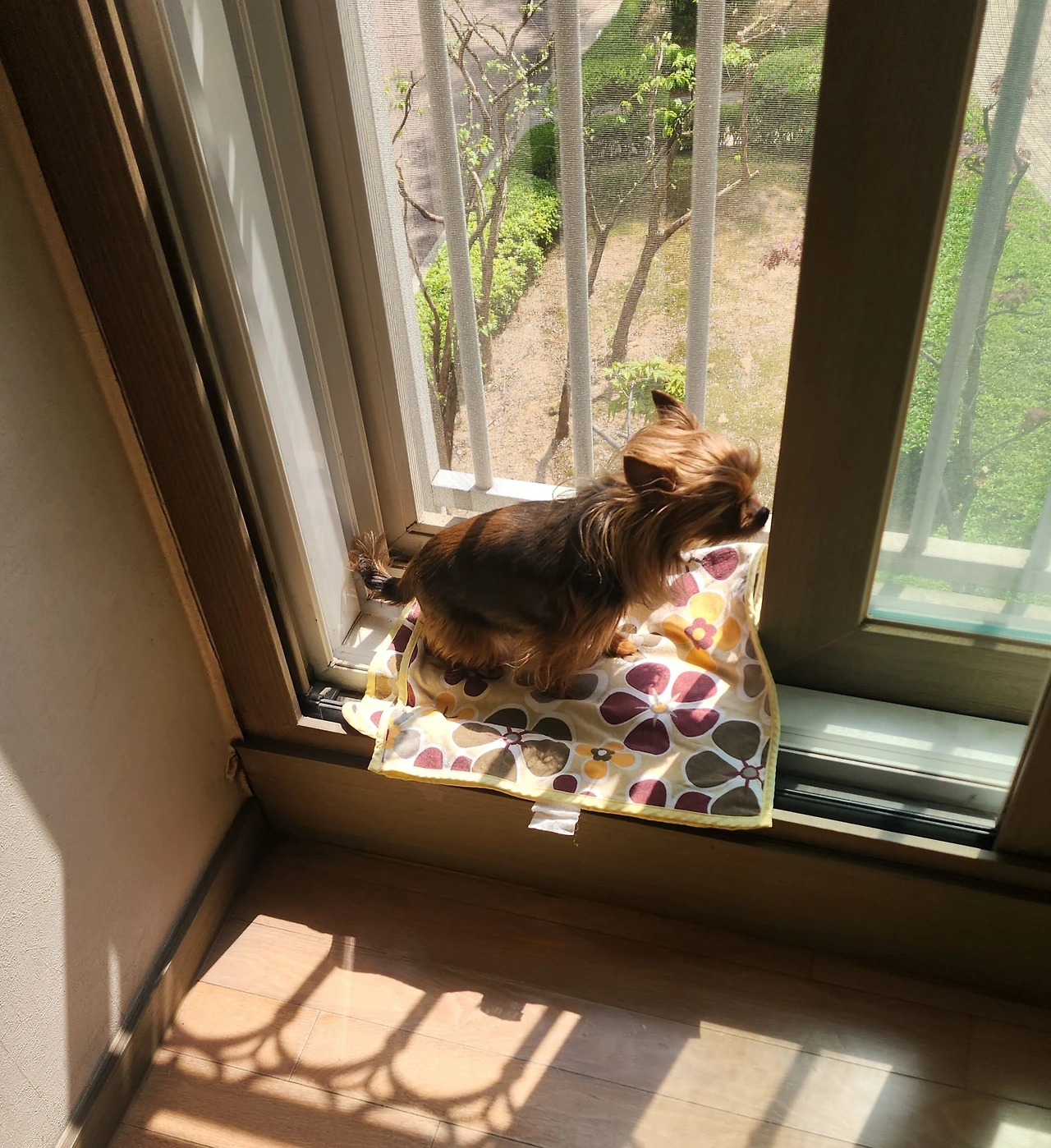 햇살이 털 위로 내려앉는다. 빛이 희끗한 털결을 따라 흘러내린다.