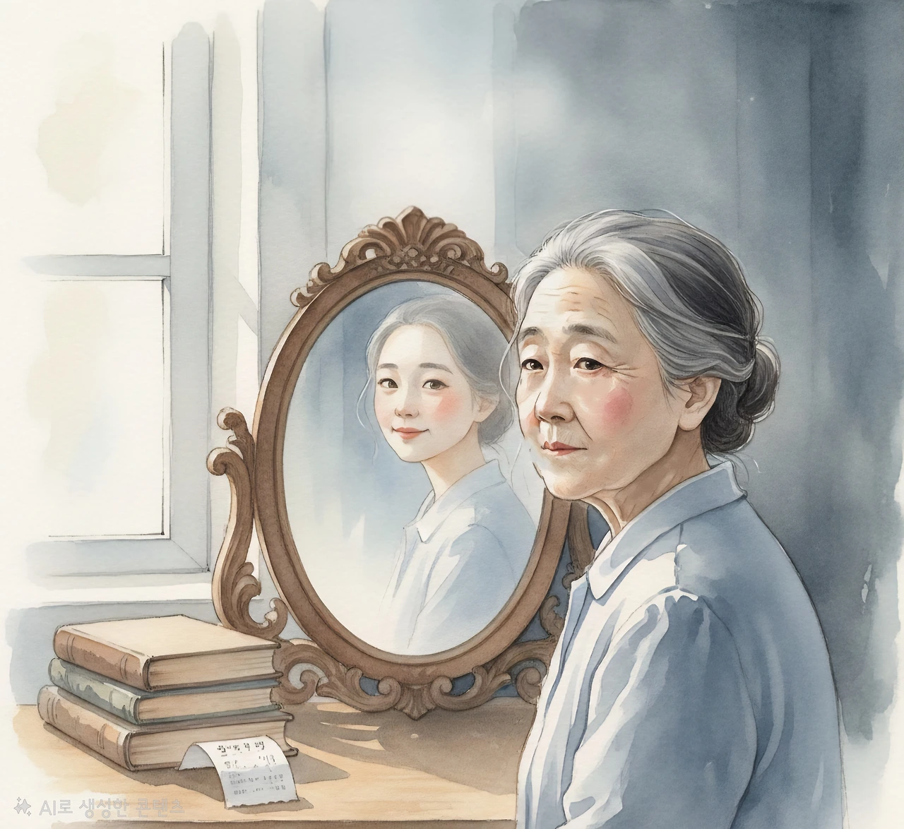 거울 속에 낯선 여자 한 명 서 있다