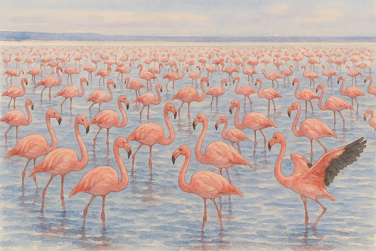 멀리서 붉은 날개를 펼친 플라밍고 떼가 날아들었다.