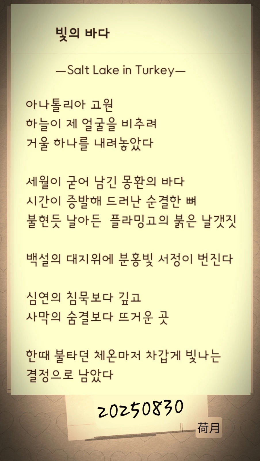 발밑에서 바스락거리던 소금 결정은 낯선 악기의 현처럼 미세한 울림을 흘렸다.