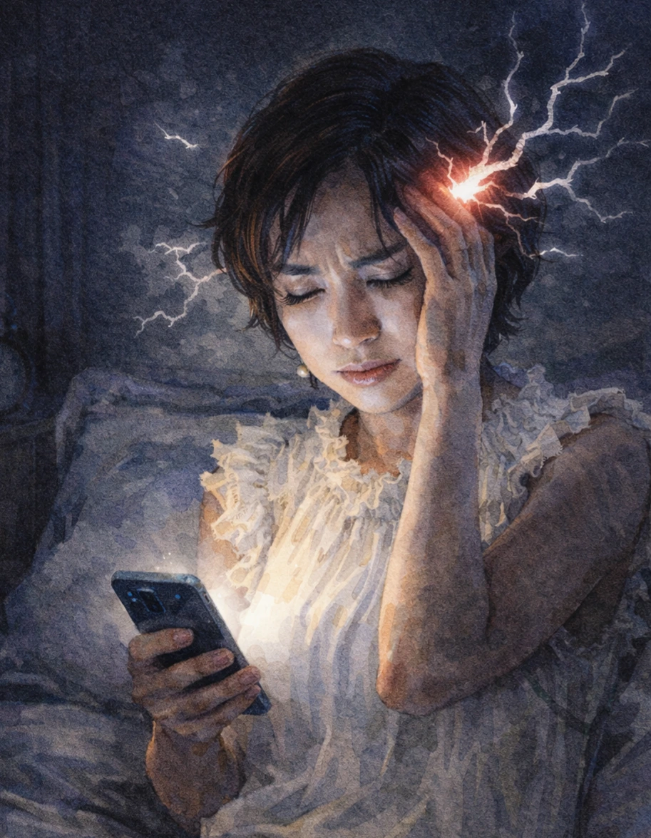 어둠 속에서 홀로 빛나는 스마트폰의 푸른 광원은 영감의 원천이 아니라,