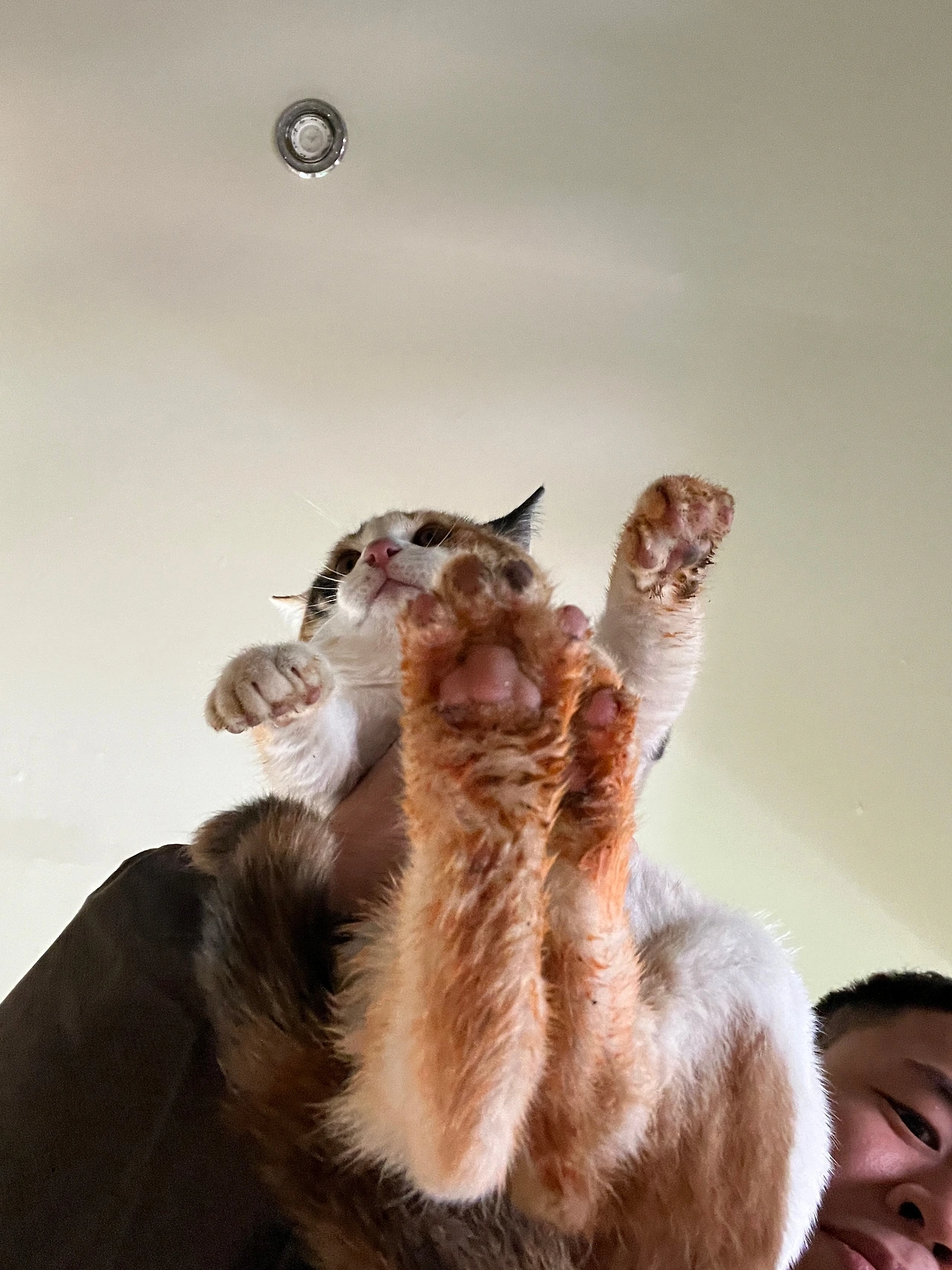 오늘의 주인공은 우리 이브와 구름이가 아니다. 굳이 따져보자면 이브 구름이의 이모뻘 되는 고양이의 이야기이다. 족보는 조금 꼬여있는 모양새다. 우리 이브와 구름이는 x살 x살인데 반해 이모 고양이인 ‘홍시’는 아직 한 살도 채 안된 초딩 고양이이니까. 전말은 이러하다. 올해 가을, 엄니[나의 장모님] 아부지[장인어른]가 시골에서 눈도 못 뜨고 엄니에게 매달리는 300그램도 안 나가는 아기 고양이와 식구가 되었다. 족보를 따져보자면 홍시는 엄니의 딸이고, 우리의 아들 딸인 이브와 구름이는 엄니에게 손자 손녀가 되는 것이니까, 이제 생후 세 달 된 홍시는 우리 이브 구름이의 이모인 셈이다. 놈들이 자신들에게 이모가 생겼는지를 알고 모르고는 중요하지 않다. 내가 이런 생각을 하며 재미있다고 생각하는 것이 중요하다. 내가 재밌으면 된다는 말이다. 매일 똥을 치워주는 나의 이 정도 유희는, 놈들도[아내 포함] 너그러이 이해해 줄 것이다. 다시 말하지만 나는 행복하다.