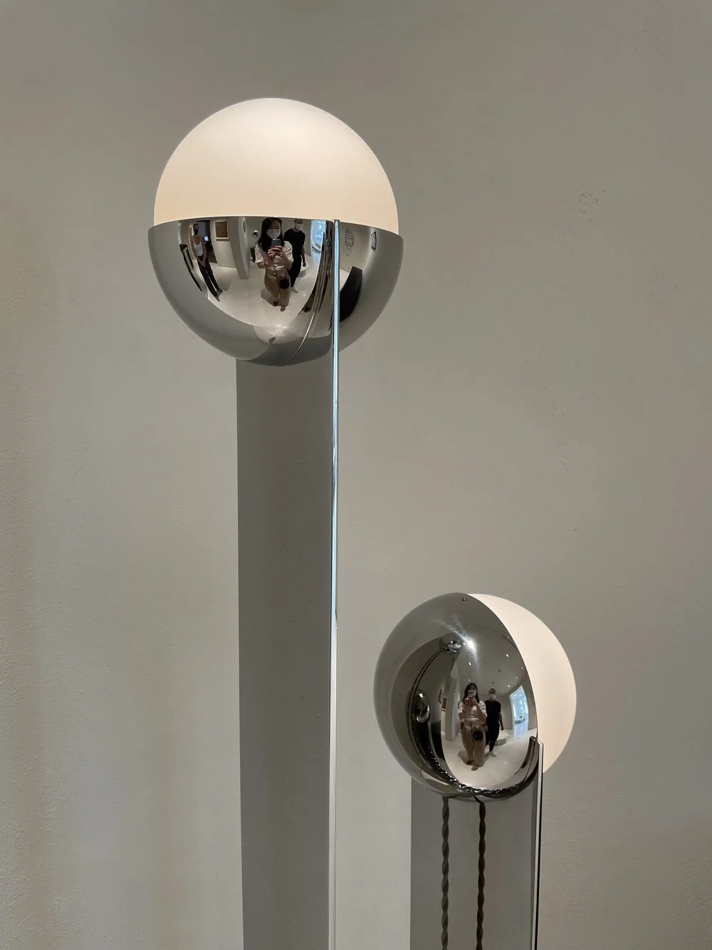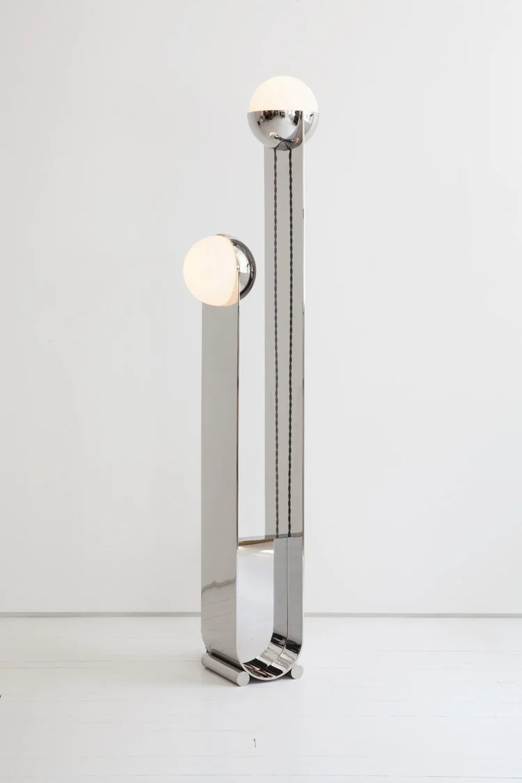 완벽한 한 쌍을 이루는 Pete & Nora 램프는 70년대 스페이스 에이지 Space Age 스타일을 연상시키는 스테인리스 재질과 심플하고 유연한 곡선의 결합이 돋보이는 조명이다. 곡선에서 뻗어져 나와 만들어진 각 면은 우아하게 떠 있는 핸드 블로잉 유리 반구체에 다다른다. 다양한 모양의 스테인리스 피스들의 접합 부분을 매끄럽게 연결하는 것이 에그 콜렉티브가 디자인 당시 특히 심혈을 기울인 부분이라고 한다. 두 반구체 유리는 바라보는 방향과 높낮이가 달라 비대칭적이고 특색 있는 빛을 만들어낸다. 터치센서로 조도 조절 및 on/off가 가능하다.