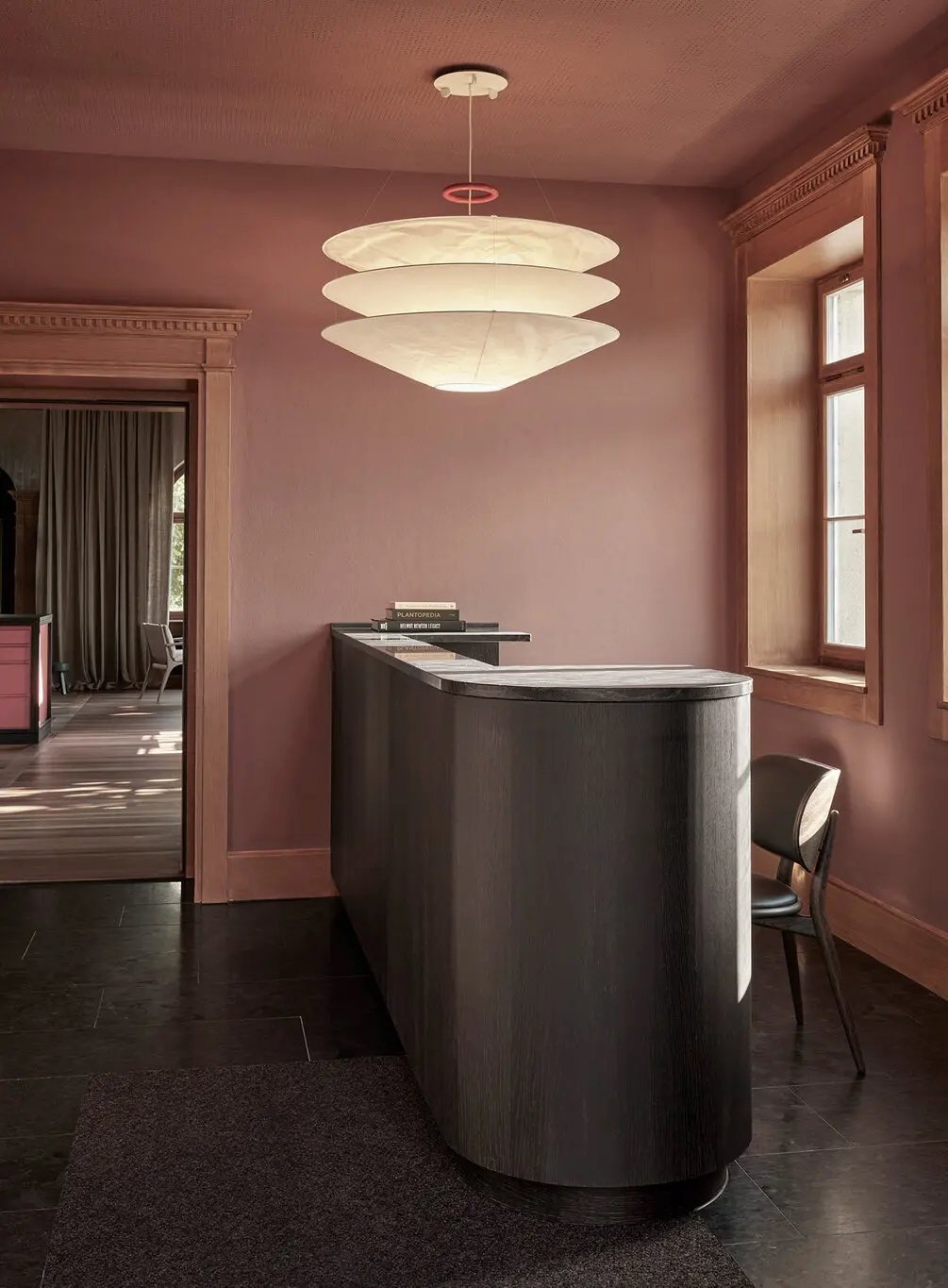Flotation은 일본의 쇼지 램프(일본의 미닫이문에 쓰인 와시 washi 종이로 만든 전통 조명)에서 영감받아 만들어졌다. 조명의 커다란 갓은 와시 소재를 그대로 활용하여 하나하나 수작업을 통해 만들어진다. 일본 종이는 자연스럽게 구김/주름이 생기는데, 소재 본연의 특성을 그대로 보여주고자 한 마우어의 의도가 엿보인다. 그렇게 만들어진 세 개의 커다란 갓은 얇은 메탈 케이블에 차곡차곡 매달려 있다. 갓의 미색과 종이의 질감에 번져 나오는 빛은 편안하고 부드럽다. 깨끗한 흰색으로 마감된 메탈 캐노피까지 깔끔하고 군더더기 없다. 조명 위 케이블에 매달려 비스듬히 걸려있는 빨간색의 에나멜 철재 링은 포인트가 되어 시선을 사로잡으면서 조명의 높이를 조절하는 균형추 역할을 한다. 갓은 각각 개별로 대체 교환 가능하며, 재료의 특성상 습도가 높은 곳에 설치하는 것은 적합하지 않다고 한다.