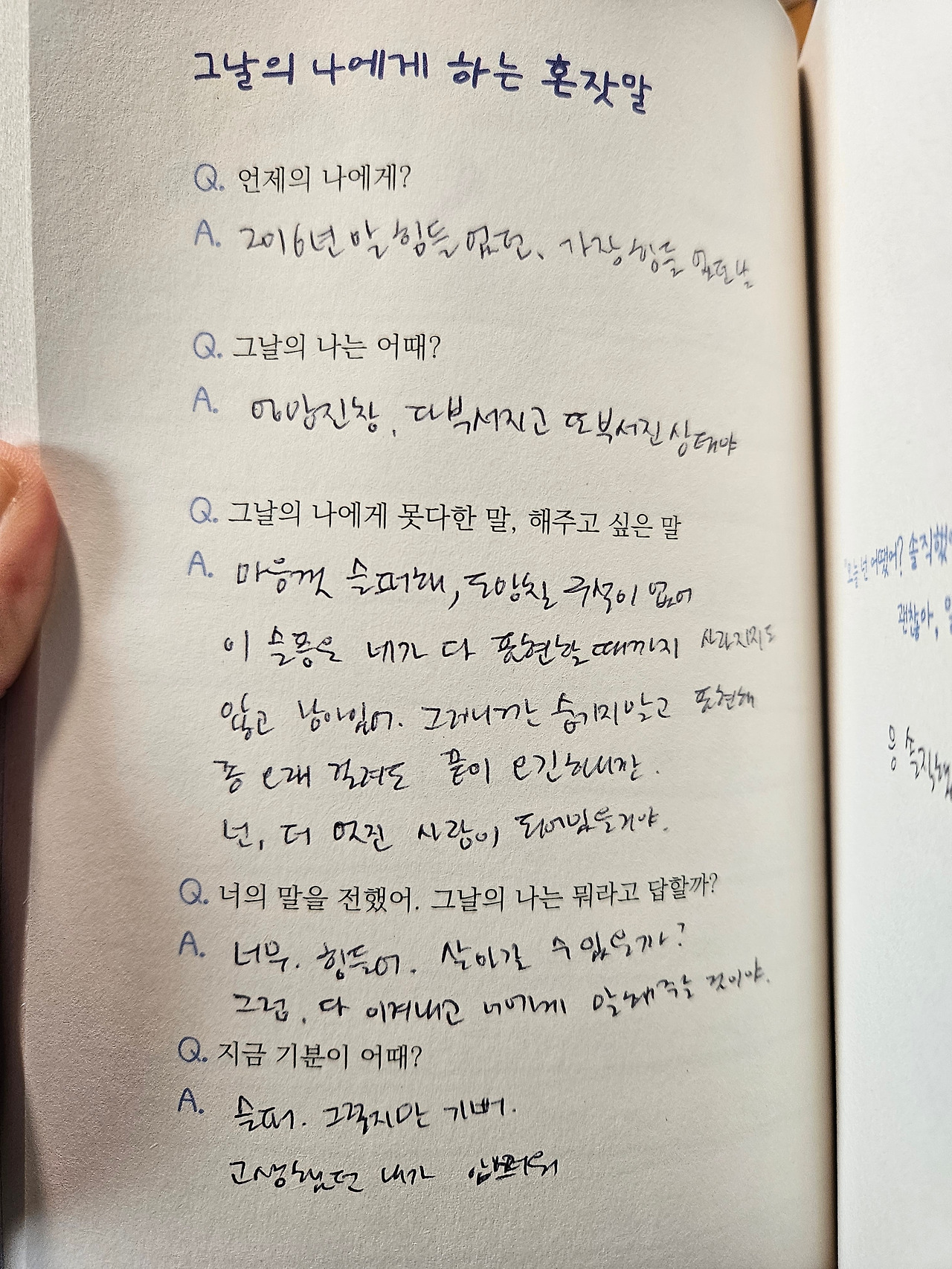 A. 슬퍼, 그렇지만 또 기뻐. 고생했던 내가 안쓰러워서 다시는 가고 싶지 않은 시간이지만, 응원하고 싶은 마음이 들어.