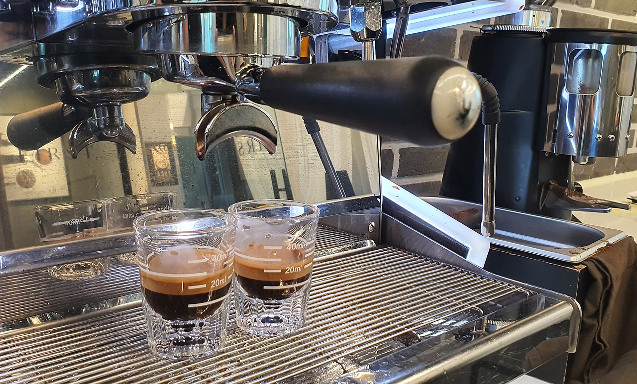 에스프레소 기계를 다루는 법을 시연하며 설명하는 걸