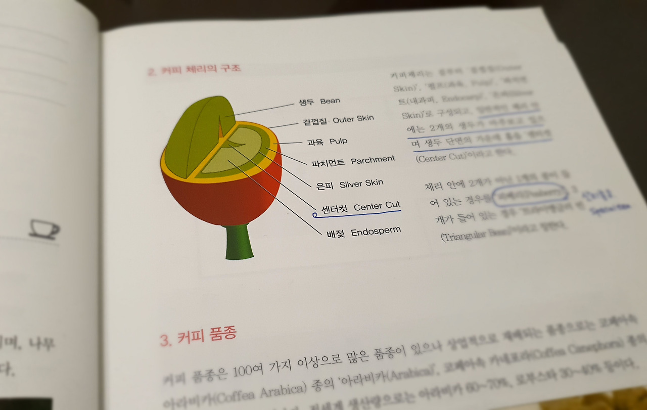 선생님과 함께 교재를 읽으며 커피의 유래와 구조에 밑줄을 긋고, 에스프레소의 추출시간, 추출 양 등에 대해 배운다.
