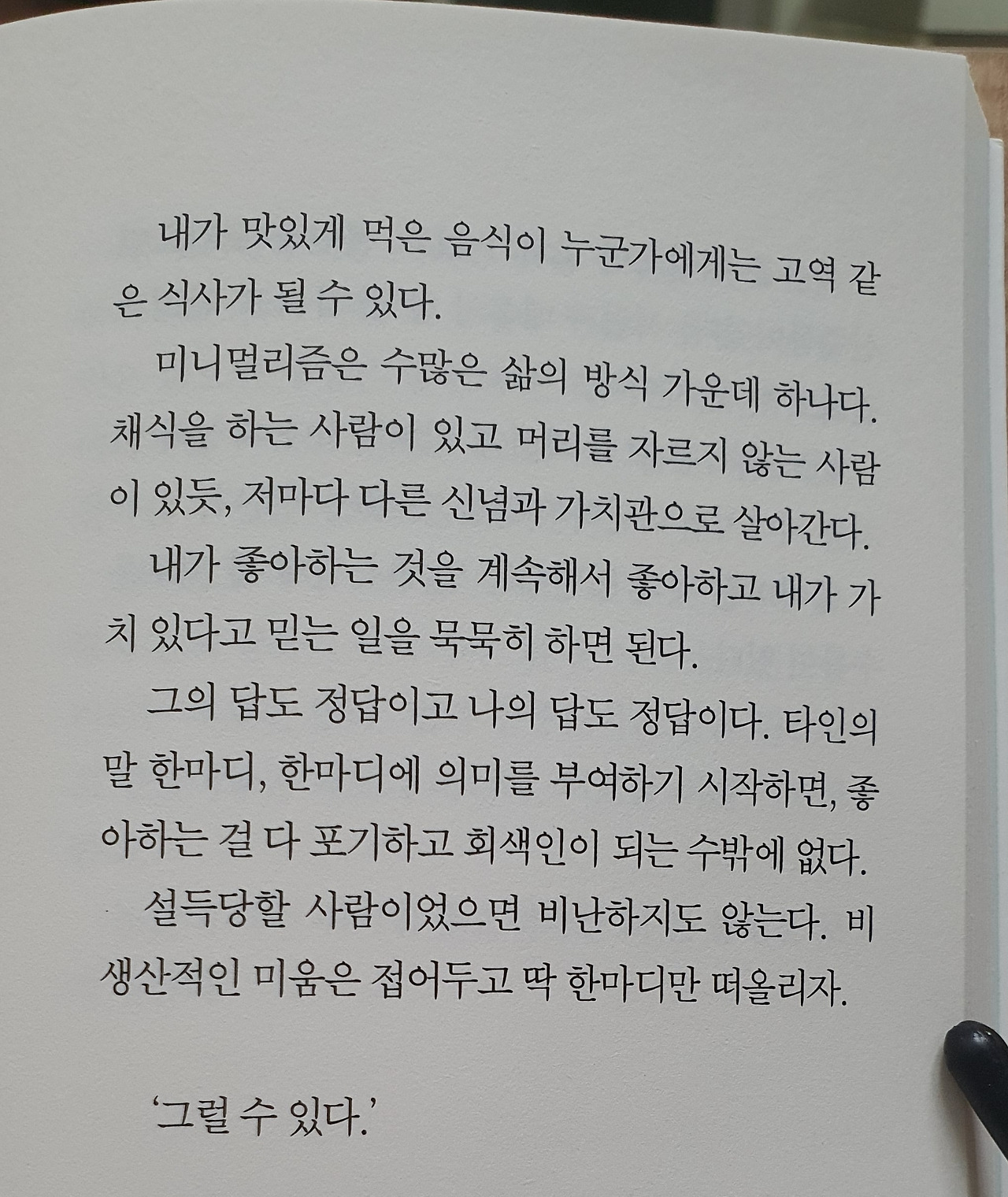 미니멀리스트였던 적이 없지만, 언젠가는... 을 꿈꾸며 미니멀리즘에 대한 책과 영상을 열심히 보던 때가 있었다. 미니멀과는 거리가 먼 사람들과 살면서 '나 혼자 사는 것도 아닌데, 뭘 어쩌겠어?', '나 혼자 살면 해 볼 수 있을 텐데...'라며 실행하지 못하는 이유를 합리화했다.