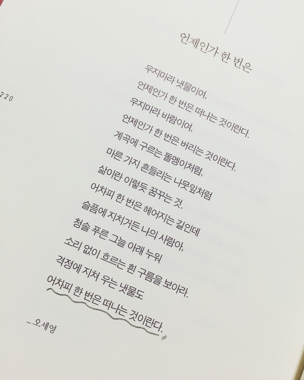 그녀는 시집을 읽고 마음이 무너져 내릴 것 같은 시들이 있었다고 했다. 그리고 그 무너져 내린 마음을 다독여주는 시도 있다 하였다. 그중 하나가 <오세영의 '언제인가 한 번은'>이다.