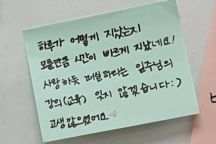 " 하루가 어떻게 지났는지 모를만큼 시간이 빠르게 지났네요! 사랑하듯 퍼실하라는 일주님의 강의(교육) 잊지 않겠습니다:)"라는 후기였습니다.