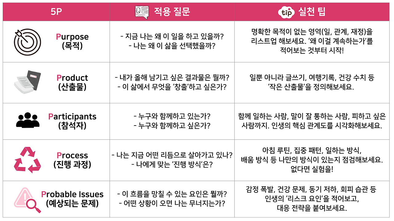 우리는 워크숍에는 공을 들이지만, 정작 인생은 흘러가는 대로 두는 경우가 많죠. 5P는 삶에도 훌륭한 ‘설계 툴’이 될 수 있습니다. 목적을 명확히 하고, 함께할 사람을 점검하고, 만들고 싶은 결과를 떠올려 보세요.