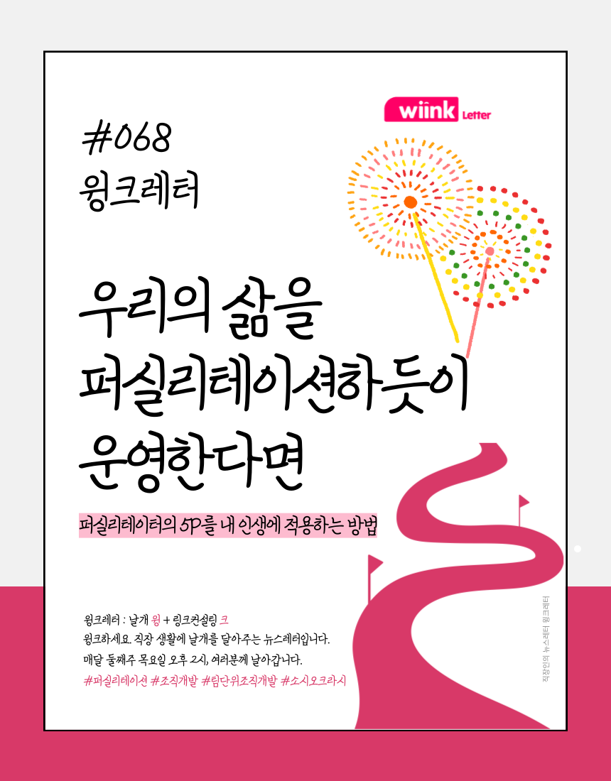 윙크레터 구독자 여러분 안녕하세요. 지난 윙크레터에서는 '일 잘 하는 회의 Check-list'를 소개해드렸는데요. 이런 회의를 만들기 위해 퍼실리테이터들이 회의나 워크숍 설계에 필수적으로 확인하는 요소들이 있습니다. 바로 5P인데요. 68번째 윙크레터에서는 퍼실리테이터들이 워크숍을 설계할 때 필수적으로 고려하는 5P를, 우리의 삶에 적용할 수 있도록 하는 몇 가지 질문들을 던져보려고 합니다.