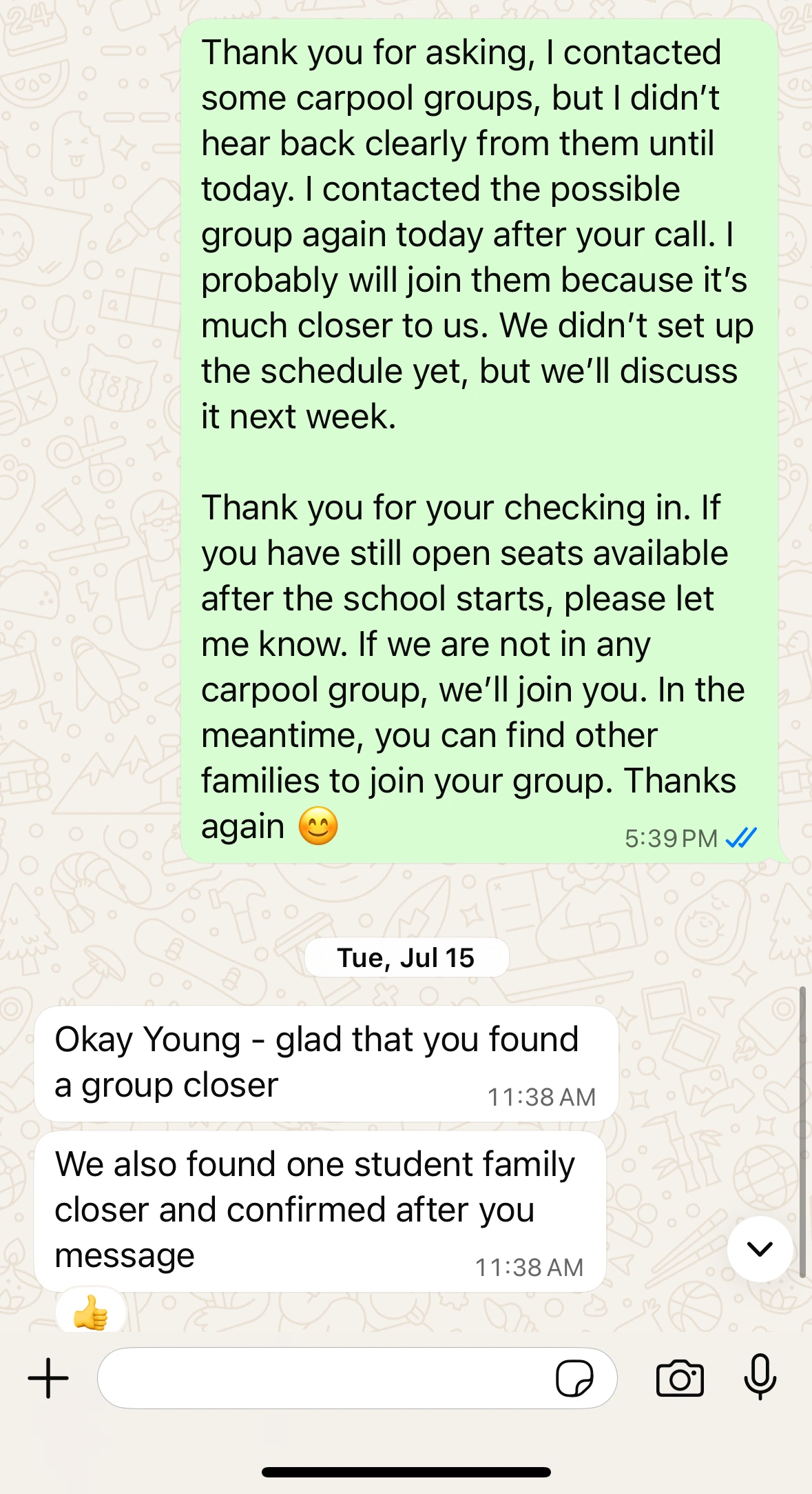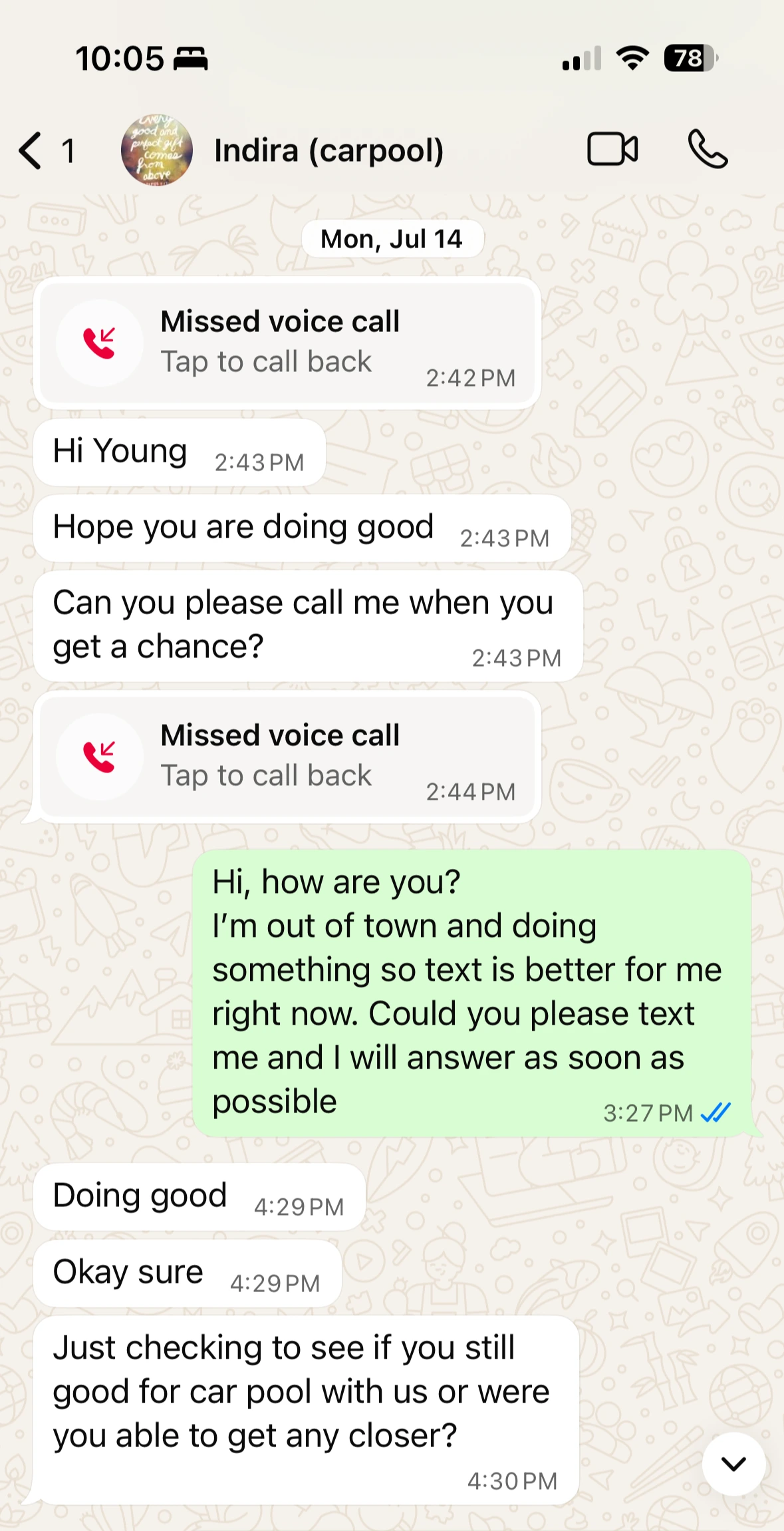 그래서 한 팀이랑 카풀을 하기러 했는데, 모이는 장소가 우리 집에서 꽤나 멀다. 그 사이 더 가까운 곳에서 카풀이 사람을 모집하길래 연락을 해 놓았었는데 반응이 뜨뜻미지근했다. 나를 카풀 그룹챗방에 초대했다고는 했는데 나는 아직 초대되지 않은, 뭐 그런 상황이다.