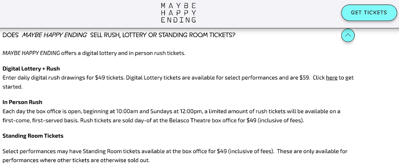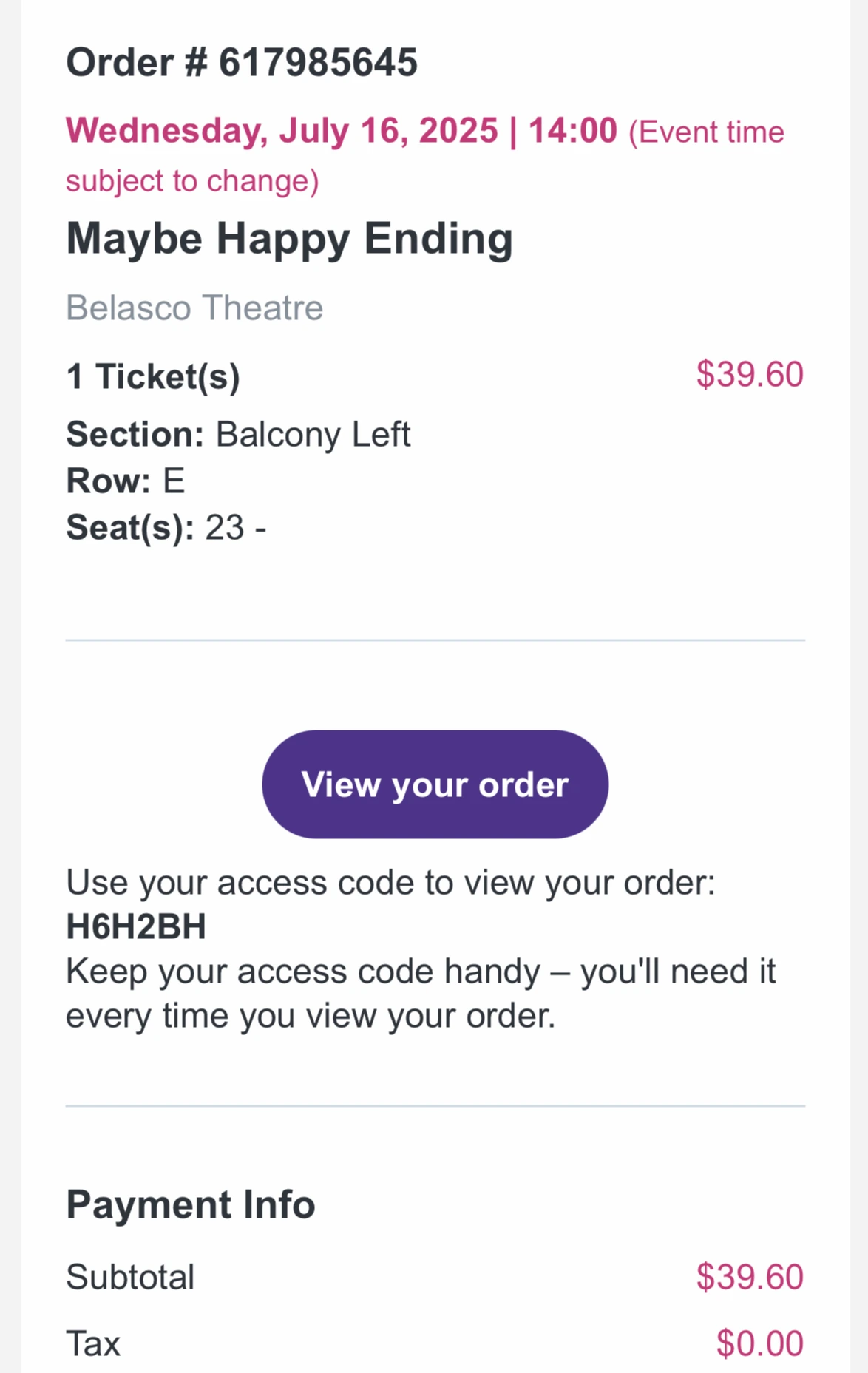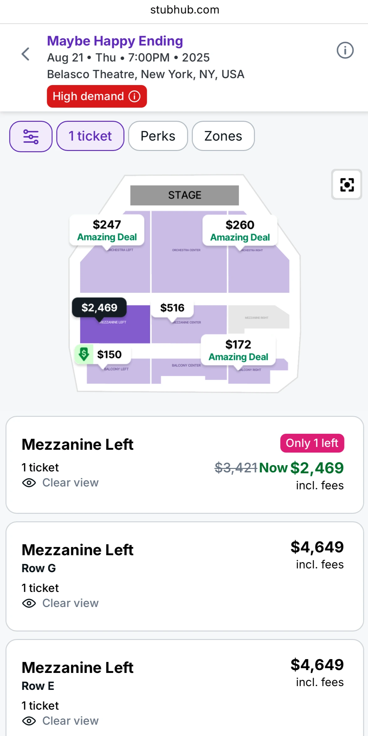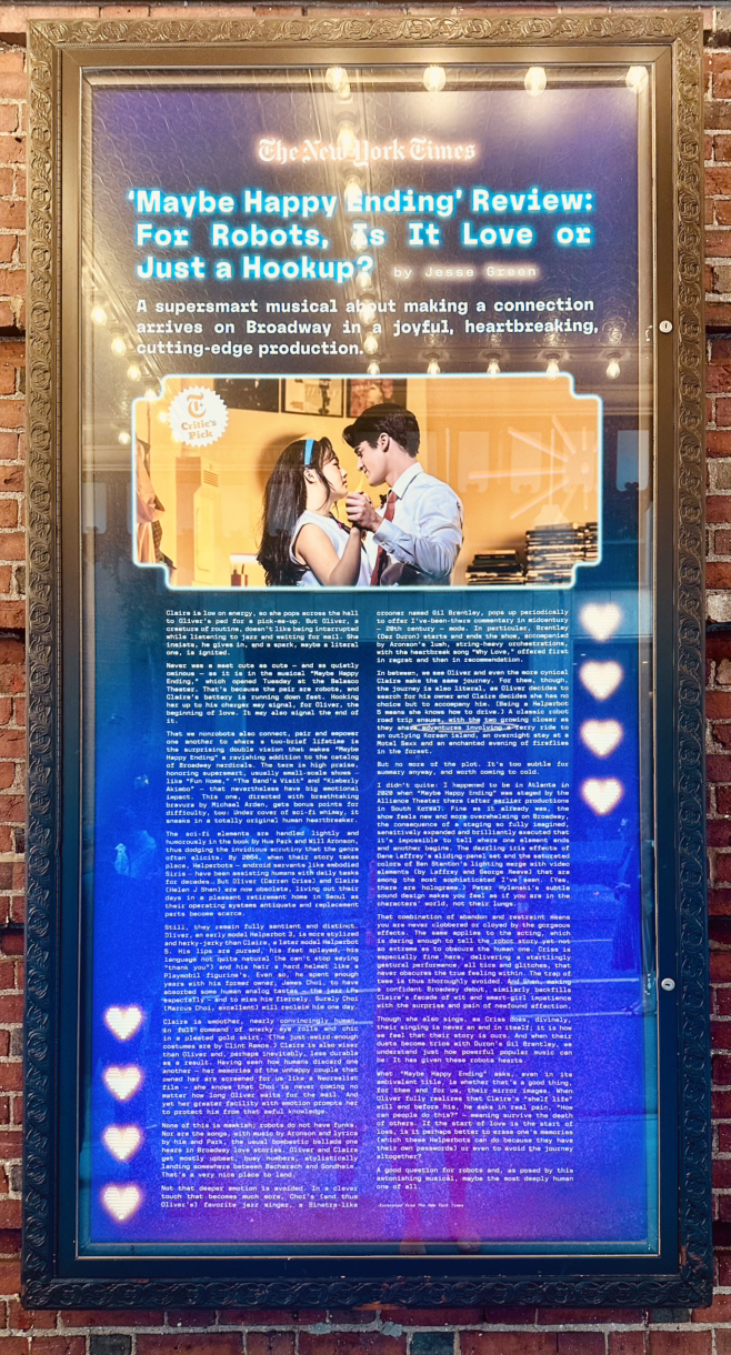 브로드웨이 뮤지컬 Maybe Happy Ending을 세금까지 다 해서 $51에 봤다. 토니상 6관왕을 받은 지 한 달 후, 2025년 7월 이야기다. 요즘 이 뮤지컬이 얼마나 핫 한 줄 알고 있다면, 당일날 그 가격에 표를 구했다는 사실에 깜짝 놀랄 거다. 물론 좋은 자리는 아니었다. 2층 왼쪽 발코니석. 공연 3분 전에 티켓팅을 했고, 시야가 조금 아쉬웠지만 공연을 잘 감상하기에는 충분했다.