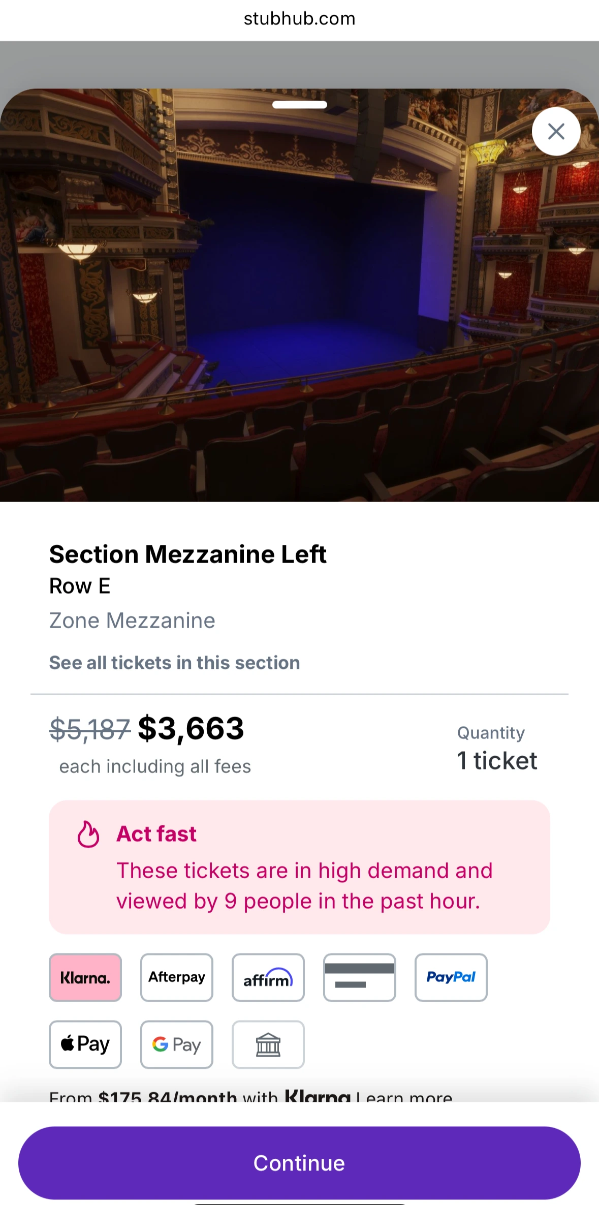 StubHub. 이상한 사이트 아닌지... 여기 안전한 거야? 심지어 남아있는 표 중에 가장 싼 건 진짜 싸다,$39.60. 그래서 또 스캠인지 의심해 보게 된다. 스텁허브, 들어 본 거 같기는 한데. 1시 56분을 지난다. 저녁 스탠딩 석이라도 있는지 궁금했지만, 에라 모르겠다 이거 놓치면 오늘 저녁 공연까지 못 볼 거 같다. 사보자.