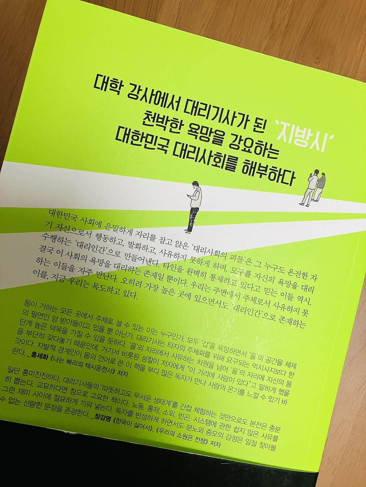 이 책을 통해 경험한 건 대리기사의 삶뿐만이 아니었다. 시간강사의 처우가 얼마나 열악한지도 알게 됐다. 작가는 젊음을 대학이라는 곳에 다 바치고도 직장 건강보험을 제공받지 못했다. 교수도 학생도 아닌 경계인이었다. 강의가 없는 방학 동안은 월급이 나오지 않는다는 사실은 꽤 충격이었다. 교수님이라는 고상한 호칭 뒤에 숨겨진 현실은 건강보험료 내기가 두려워 혼인신고조차 못하는 시간강사들이 많다는 사실이었다. 작가는 노동을 통해 그의 언어를 몸에 새겼고 세상의 전부였던 대학에서 나와 대리인간이 아닌 온전한 주체로서 완벽하게 서 있었다.