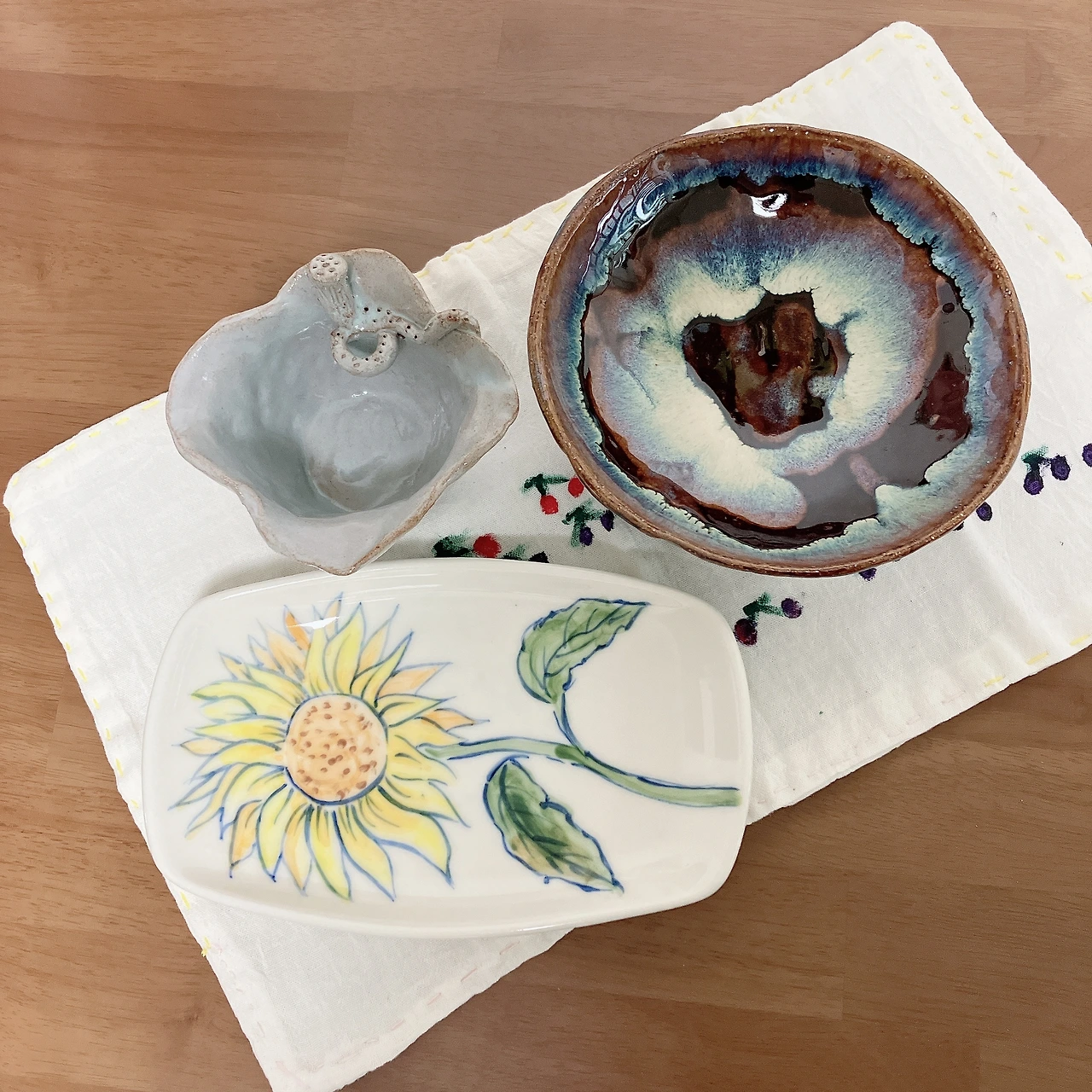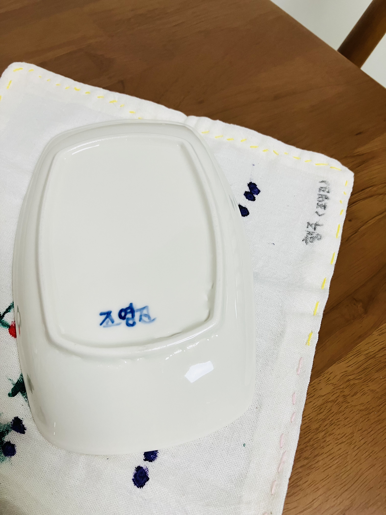 동생이 만든 작품 뒤엔 동생 이름이 쓰여있다. 이름만 봐도 동생을 보는 것 같다. 테이블매트나 행주엔 "늘 예쁘거라."라는 글씨가 쓰여있다. 귀엽고 예쁜 것을 좋아하는 동생답게 한결같이 쓰여있는 문구. 나는 동생이 만든 작품에 맛있고 향기로운 것들을 담는다. 커피를 내릴 때, 토요일 아침 브런치를 먹을 때, 과일 담을 때…. 동생이 쓴 이름을 한번 보고 위로받는 마음으로 시간을 보낸다.
