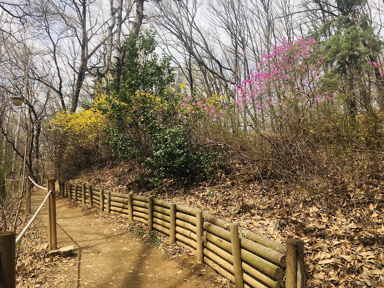 회사 뒷산, 샛노랑, 선명한 초록, 진분홍의 조화가 좋았다. 와 순간 나뭇가지 보고 엄청 놀랐다. 연가시를 본 다음날 비 맞으러 도로에 나온 뱀 만한(?) 지렁이를 보고 까무라치게 놀랐던 날이 생각났다.