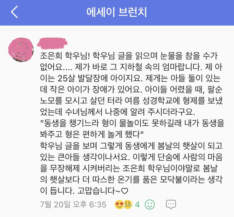 조은희 학우님! 학우님 글을 읽으며 눈물을 참을 수가 없어요.... 제가 바로 그 지하철 속의 엄마랍니다. 제 아이는 25살 발달장애 아이지요. 제게는 아들 둘이 있는데 작은 아이가 장애가 있어요. 아이들 어렸을 때, 팔순 노모를 모시고 살던 터라 여름 성경학교에 형제를 보냈었는데 수녀님께서 나중에 알려 주시더라구요.