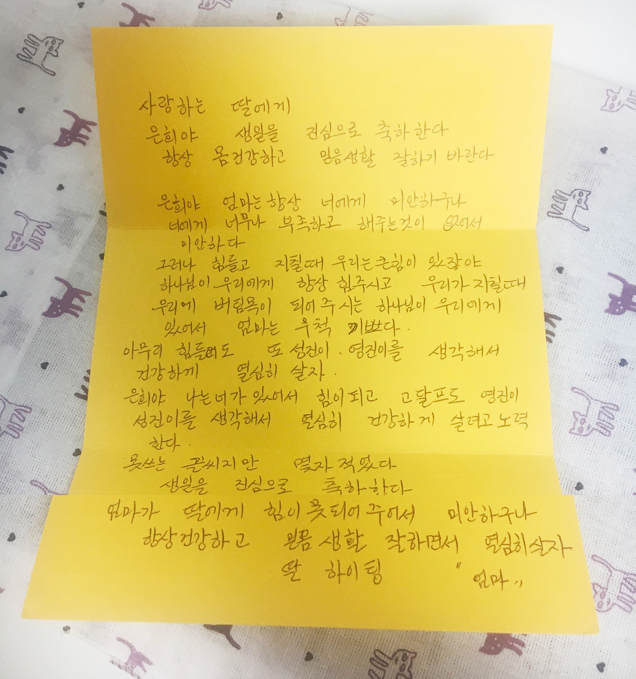 엄마의 편지를 보며 다음번에 엄마를 만나면 꼭 손잡고 걸어야지 다짐했다. 부끄러워서 손잡고 걷기는 매번 실패하고 괜히 “엄마”하고 안기만 했다. 이번 추석엔 드디어 엄마 손을 잡았다. 고생만 한 엄마 손이 거칠고 까슬까슬할 거라 생각했는데 부드러웠다. 포근하고 따뜻했다. 엄마의 손을 잡으니 엄마를 꼭 껴안은 것 같았다. 다음번엔 더 오래오래 잡아야지.