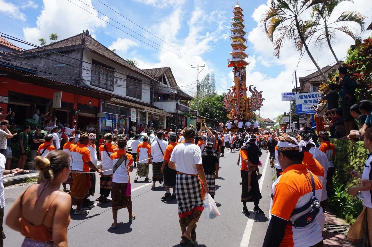 지도를 따라 우붓의 중심 거리로 갔더니 벌써 장례 행렬 준비가 한창이었다. 왕가의 하인으로 보이는 사람들이 갓길에 주차된 차들을 인도로 번쩍 들어 올리고 구경 나온 인파를 길 양 끝으로 몰았다. 장례식 준비였지만 그들의 표정은 밝았다. 장례식 주인공이 좋은 곳으로 갔다는 믿음이 확고한 듯했다.
