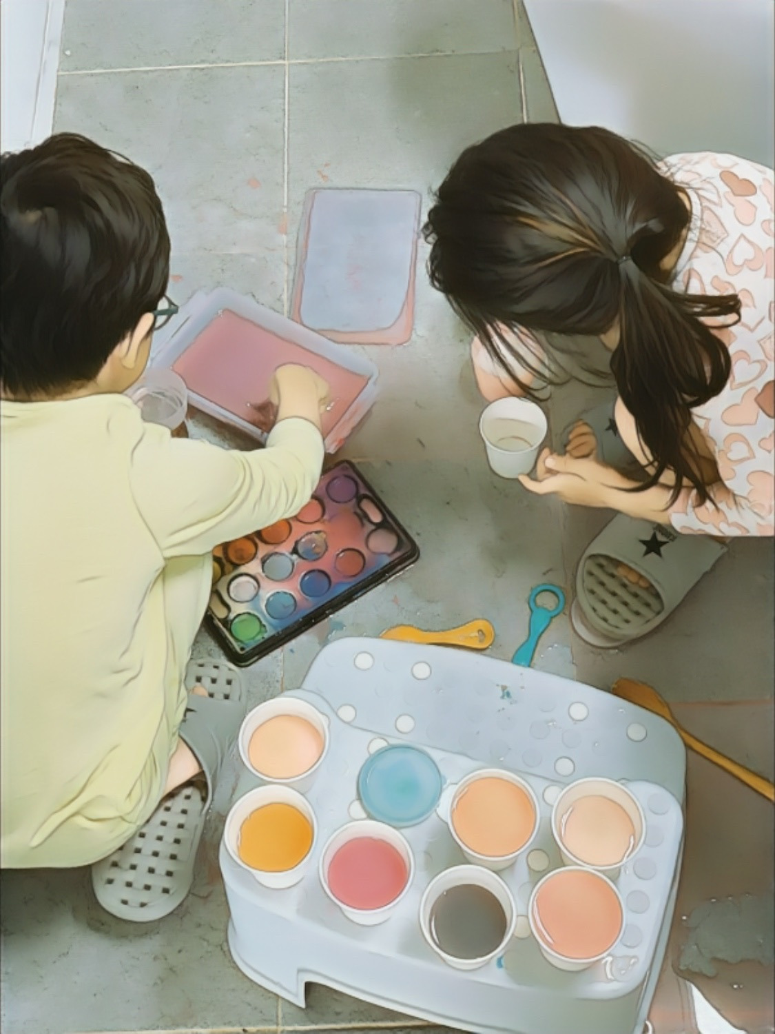 "물감 놀이는 물이 필요해!! 그러니까 물이 넉넉한 화장실에서 해야지~~~~!"