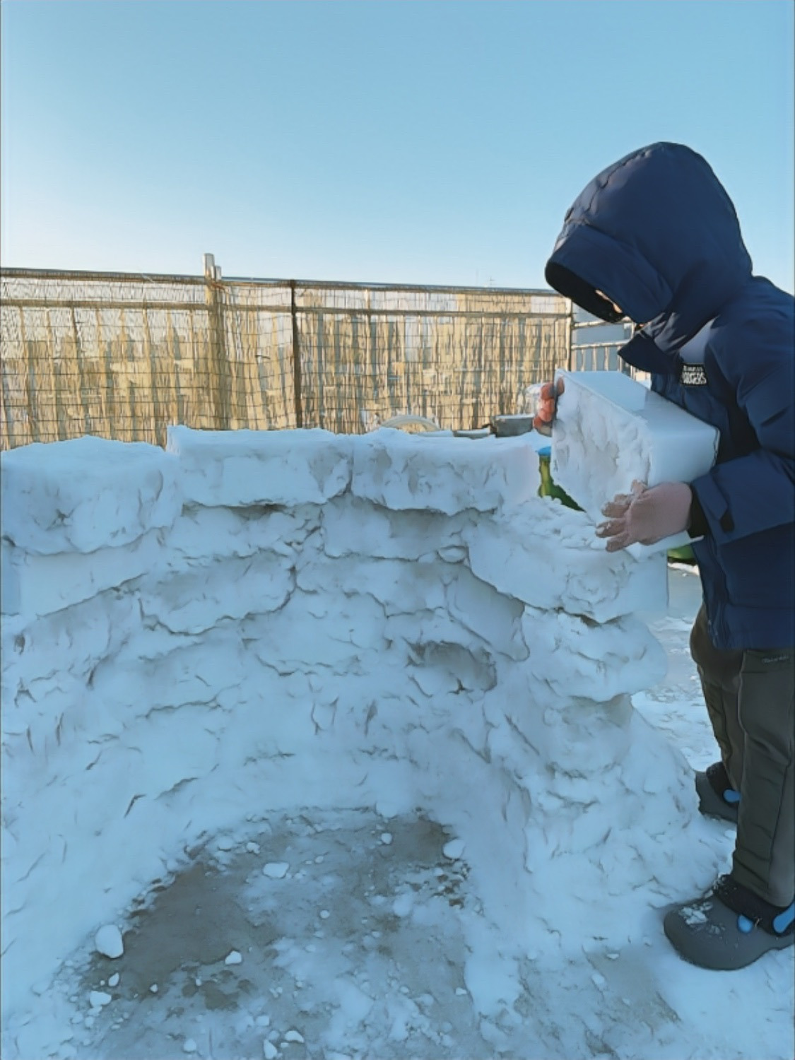약속대로 점심을 먹고 해가 머리 위로 올라오고 아들은 이글루를 만들겠다며 장난감 통을 비워 옥상으로 갔다. 뒷정리를 하느라 바로 따라가진 못했는데 아빠와 본 동영상의 효과인지 혼자서 기초 공사를 시작하고 있었다.