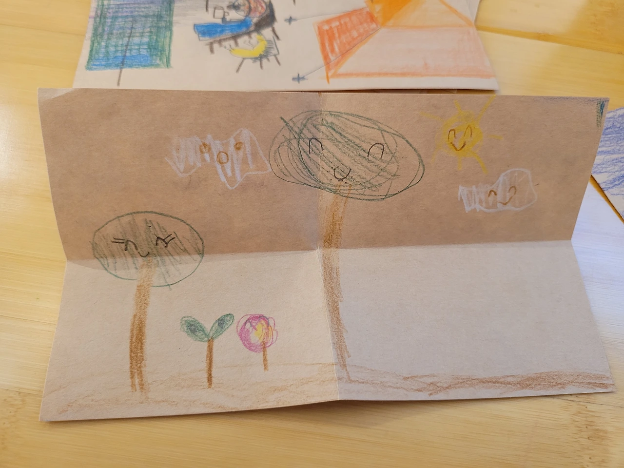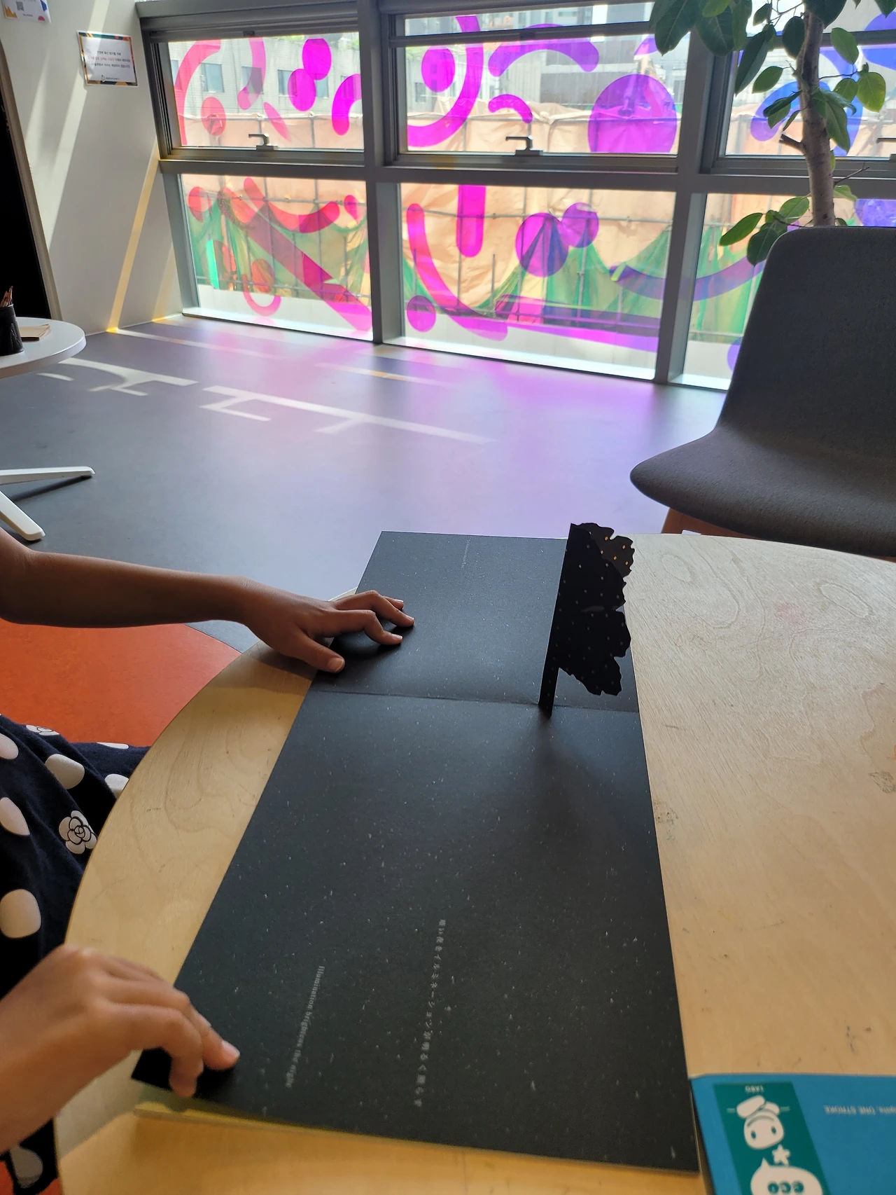 전시 관람이 끝나고 그림책을 보는 곳으로 나오면 중간에 색연필과 종이가 놓인 공간에서 자유롭게 그림을 그릴 수 있다. 아이들은 오늘 나무를 많이 그린다. 책을 넘길 때마가 계절이 바뀌며 나무의 변화가 잘 나타나는 팝업북이 인상적이었나 보다.