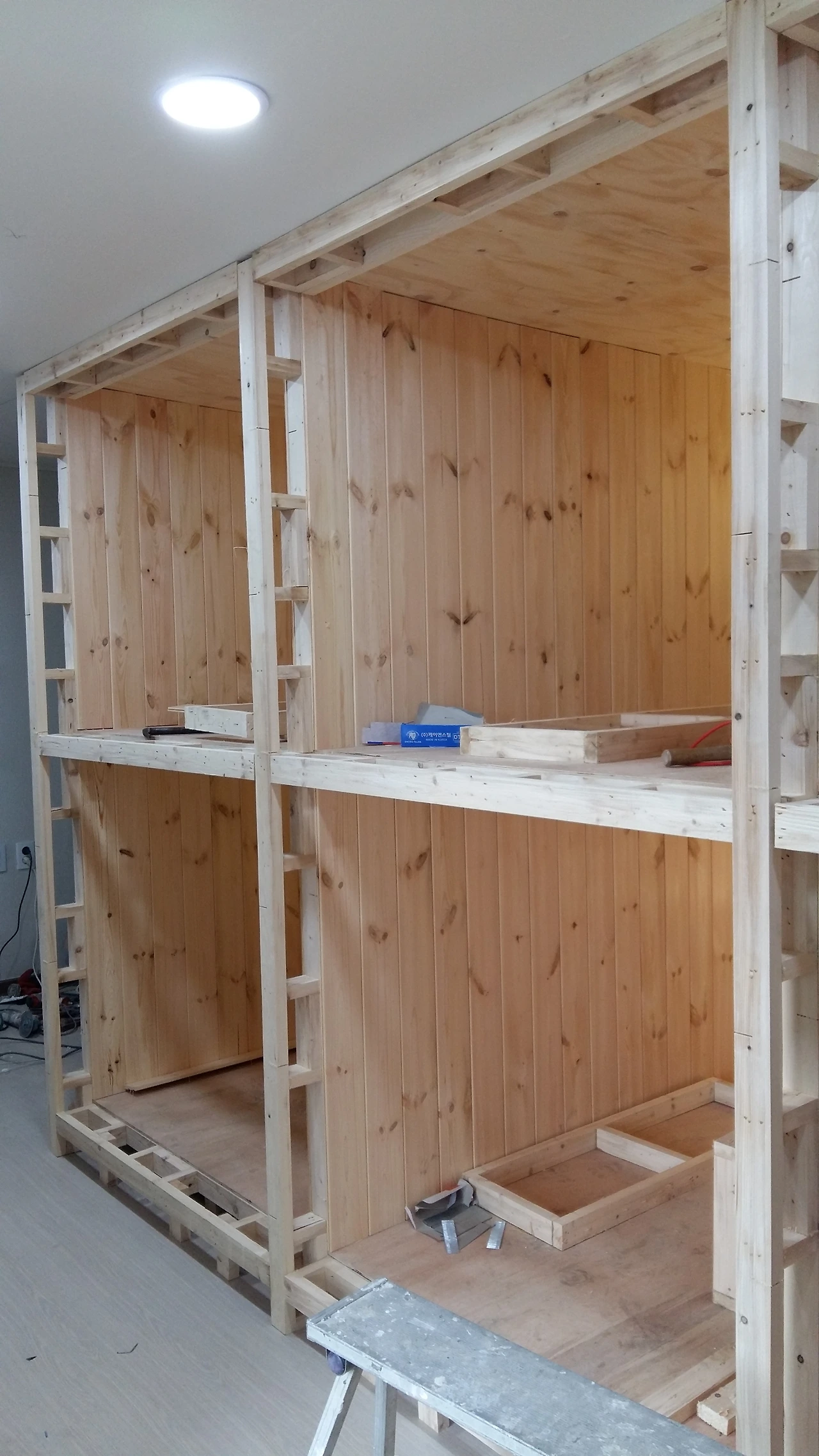 내부 공사 중 가장 큰 비중을 차지했던 건 침대 제작과 화장실 공사였다. 남자 방과 여자 방에는 각 6인이 머무를 수 있는 침대를 캡슐 형태로 제작할 생각이었고 작은방은 온돌 형태의 2인실로 꾸밀 계획이었다. 화장실 같은 경우는 보일러실과 창고, 그리고 원래 있던 화장실까지 총 4곳의 리모델링이 필요했다.