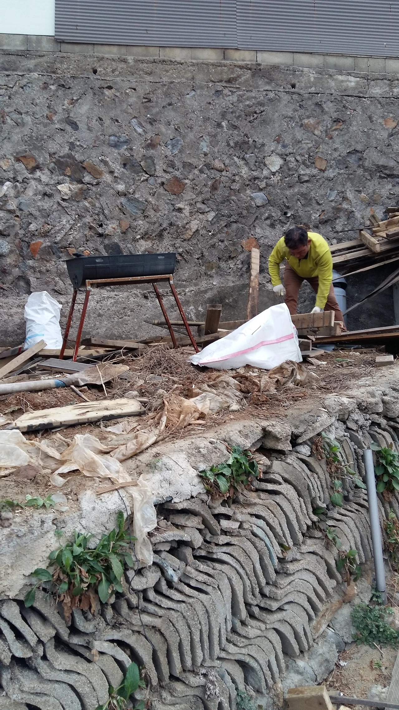테라스 땅이 문보다 높아 전에 조금 의아했었는데 철거를 시작하자마자 그 의문이 풀렸다. 나무 데크로 덮여있던 바닥을 뜯어내기 시작하자 땅속에서 유리 조각, 나무, 못, 플라스틱, 심지어 변기까지 온갖 잡동사니가 나오기 시작했다. 그 양이 도저히 삽으로 해결될 수준이 아니라 결국은 드릴로 땅을 깊숙이 파내며 폐기물을 꺼내야 했다. 차가 집 앞까지 못 들어오는 관계로 폐기물을 들고 나르는데만 매일 두 명씩 꼬박 며칠이 걸렸다.