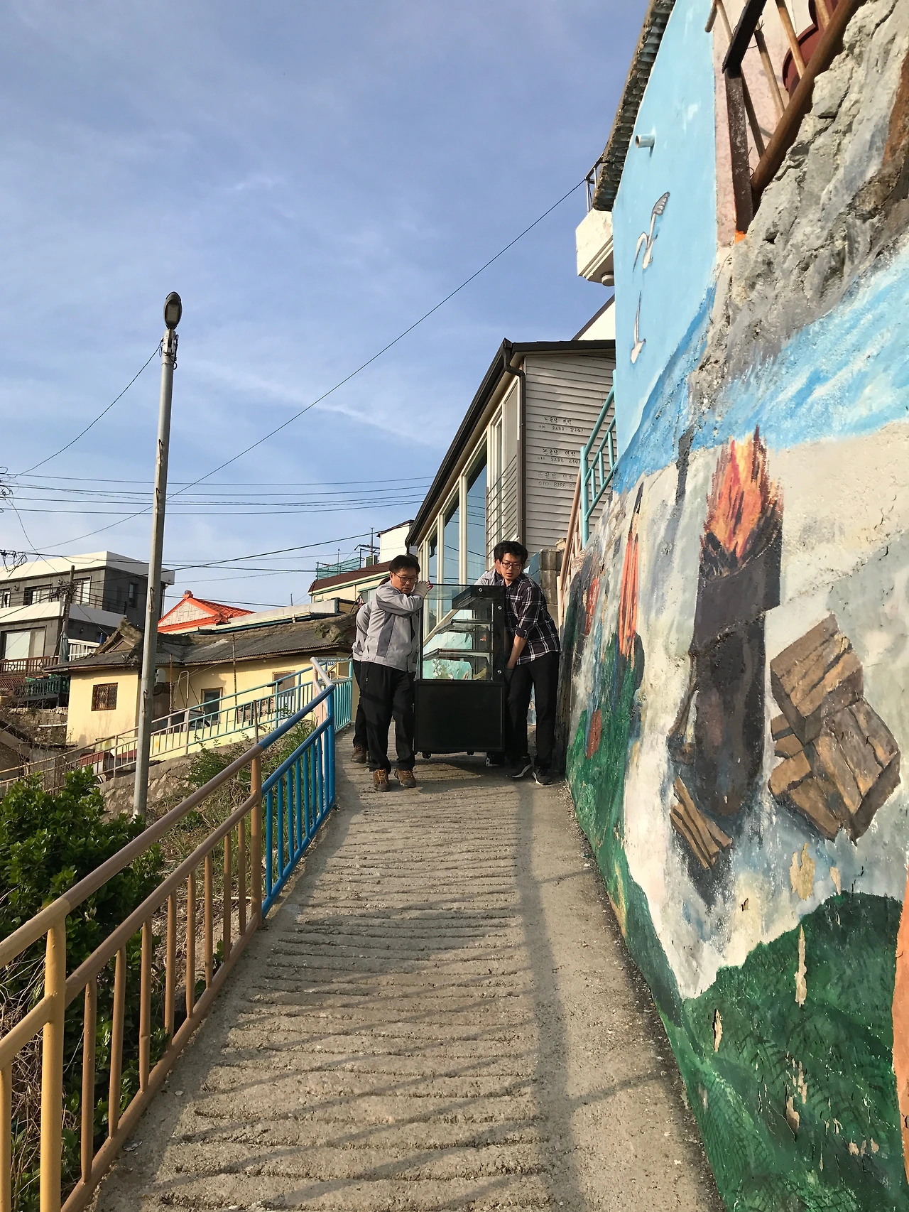 카페 쇼케이스는 강릉의 한 중고매장에서 구매했는데 배송은 며칠 뒤 직접 해주시기로 했다. 구매할 때부터 차가 집 앞까지 안 들어오는 언덕 좁은 길의 동네이니 꼭 카트를 가져오시고 최소 2명 이상은 오시기를 당부드렸다. 물건을 판매하신 여자 사장님께서 배송이 안 되는 지역이 어딨냐며 걱정하지 말라고 남편분과 직원분들이 잘해줄 거라고 말씀하셨다. 당시 너무 쉽게 생각하시는 것 같아 조금 걱정되긴 했지만 충분히 당부했으니 괜찮을 거로 생각했다. 약속한 배송 날, 마음의 준비를 하고 묵호등대로 나가보니 역시나 카트는 없고 남자 사장님과 직원 두 분께서 차에서 내리셨다.