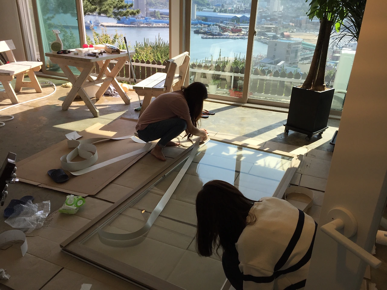 주말엔 가구 세팅을 위해 준비한 테이블과 의자를 모두 조립하고 서울에 있는 친구들을 동원해 혼자 들기 힘든 무거운 짐을 함께 버리고 벌레로 가득 찬 창틀을 모두 들어내 깨끗하게 청소했다. 창틀, 몰딩, 주방 수납장은 시트지와 페인트로 마감을 했고 허전했던 공간은 초록 초록한 나무와 소품들로 채워지기 시작했다.