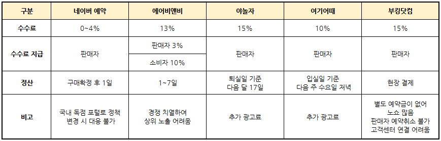 이밖에 부킹닷컴, 에어비앤비, 야놀자, 여기 어때 등의 예약 플랫폼도 이용 가능한데 펜션 같은 경우 내국인 손님은 야놀자와 에어비앤비, 네이버 사용 비율이 높은 편이고 외국인 손님은 부킹닷컴과 에어비앤비 사용 비율이 높은 편이다. 에어비앤비는 호스트 친화적인 정책으로 후발 주자임에도 국내에서 많은 숙소를 확보할 수 있었는데, 이제는 워낙 경쟁이 치열해져 오픈 특가 등으로 한동안 저렴하게 숙소를 제공한 뒤 리뷰를 쌓지 않으면 고객 유치나 상위 노출이 쉽지 않을 수 있다.