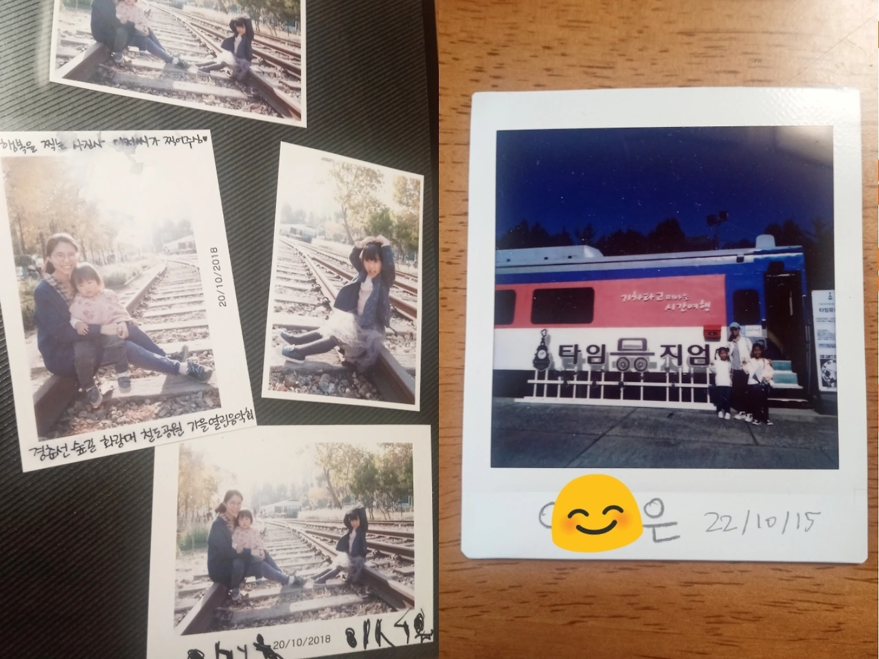 딱 4년 전에 열린 음악회를 한다 하여 여기 왔었는데, 자신을 '행복을 찍는 사진사'라며 사진을 찍어 즉석으로 인화해 주는 아저씨가 계셨다. 누구에게 후원을 받거나 기관에서 나온 것이 아니라 순전히 이웃의 행복한 순간을 남겨주고 싶은 기쁨에 이 일을 한다던 그 분이 선사한 감동은 사진 넉 장과 함께 사진첩에 고이 모셔 두었다. 그런데 오늘 반갑게도 가족끼리 첫번째 미션이 사진 찍기이다. 배경을 골라 서면 즉석사진을 찍어주겠다 한다. 가로세로 6cm 남짓 되려나? 무궁화호 앞에 선 우리 셋은 자그마하여 표정은 보이지조차 않는다. 그러나 브이한 손가락 위의 얼굴에는 미소와 설레임이 깃들어 있음이 충분히 전해진다.