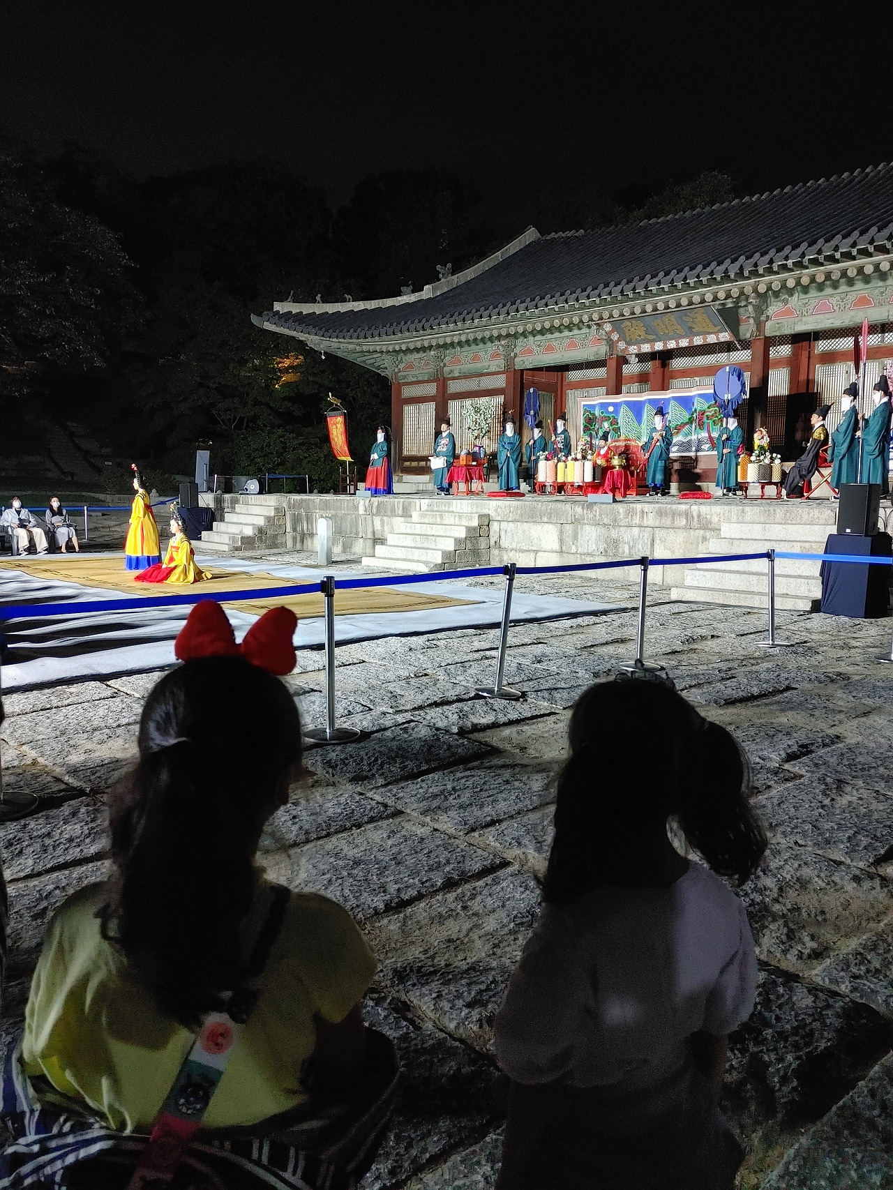 참 오길 잘했다. 이렇게 예약을 했기 때문에 우리가 나올 수 있었던 거지. 고즈넉한 풍경 속에 풍악이 울리면 기쁨이 별가루가 되어 반짝반짝 밤공기 속에 빛나는거지. 그 속을 함께 걷는 우리 가족은 돈으로도 살 수 없는 멋진 추억 하나를 공유하게 된거지. 엄마는 서울의 밤공기를 쐬어 보셨고 사위가, 그리고 잠시는 막내손주가 고사리손으로 미는 휠체어를 타 보셨다(조마조마 하셨을 거다). 아빠는 조명 속에 은은하게 빛나는 밤의 창경궁의 멋을 느끼셨고 혼자 엄마를 챙겨야 한다는 부담에서 벗어나 당신이 좋아하는 것을 즐기셨다. 서은가은에게도 창원할아버지 할머니와 함께 다닌 기억이 많이 남길 바란다.