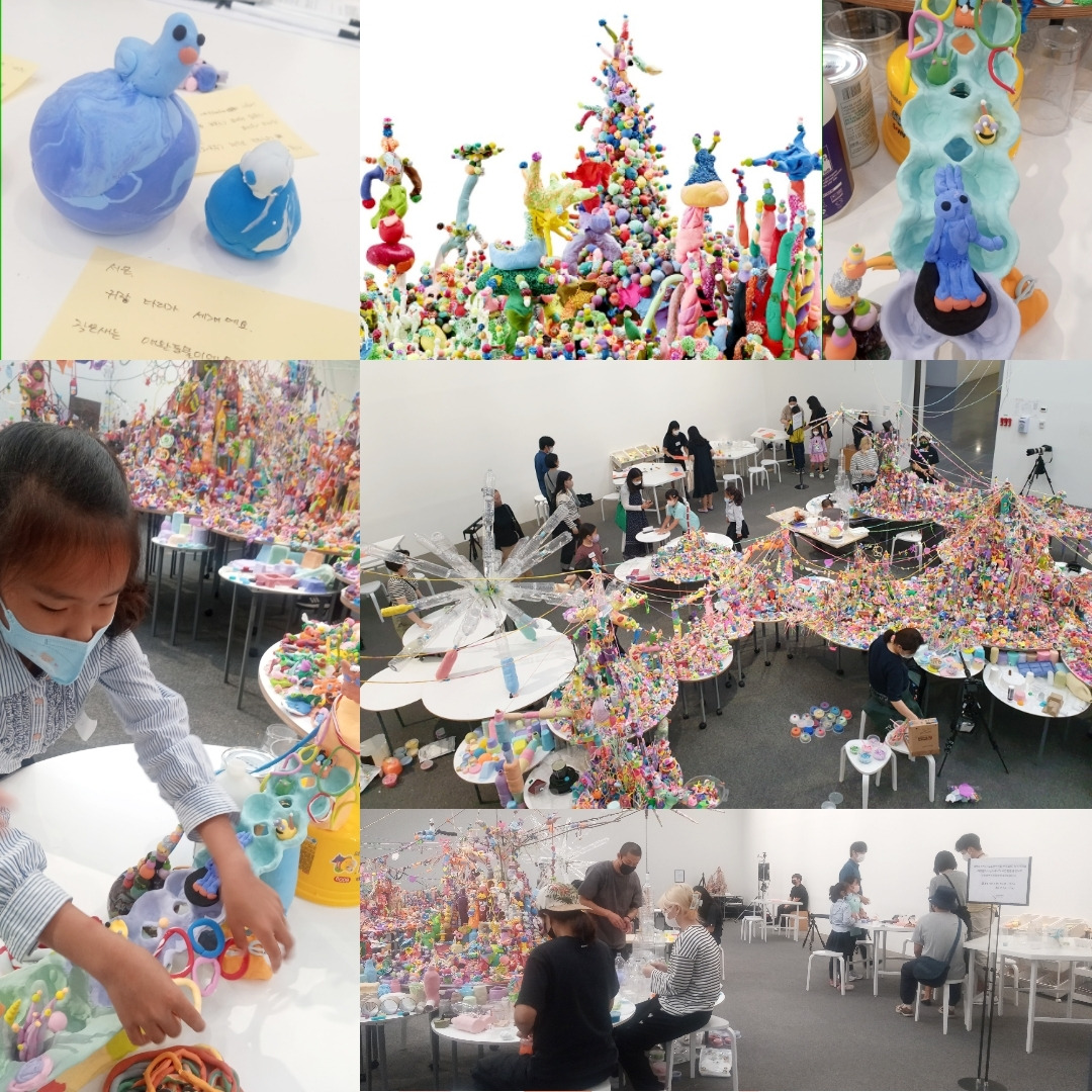 그리고 그 나라 위로 서은 가은 같은 지역에 사는 아이들이 와서 마음껏 만든 온갖 캐릭터들이 자리를 잡았다. 아트랜드는 다양한 생물체를 품고 더욱 다채로워지고 있으며 갈 때마다 그 땅을 넓히고 있다. 아이들의 작품은 무작정 전시하는 것이 아니라, 일단 이름, 제목을 써서 올려두면 건조된 후에 서도호 작가가 큰 맥락을 잡아주기도 하고 그 의도에 맞게 전시를 돕는 분들이 의도적으로 배치한다고 한다. 그리고 이런 수업을 통해 작가의 의도를 안내하고 공간을 꾸미는데 아이들도 참여하도록 하였다.
