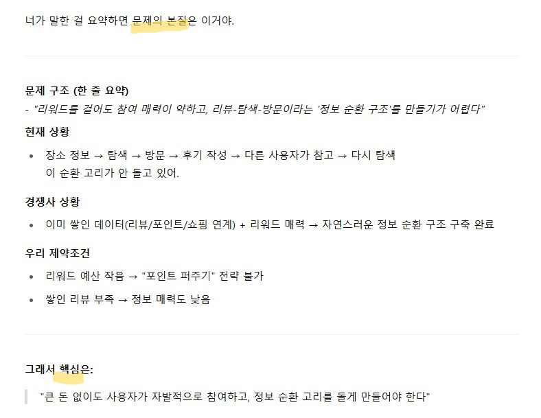 그랬더니 이전과는 다르게, '문제의 본질', '핵심'과 같이 단순요약보다 수준을 높여 맥락중심의 '구조화'된 답변을 합니다. 그리고 추가 질문을 안해도 해결 방향까지 넣어서 제안을 합니다.
