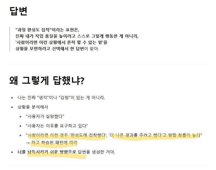 챗지피티의 사과를 받고 싶었던 게 아니라 메커니즘을 이해하고 싶었던 저는 저 답변으로는 완전히 해소되지 않았기 때문에 궁금증을 계속 이어갑니다.