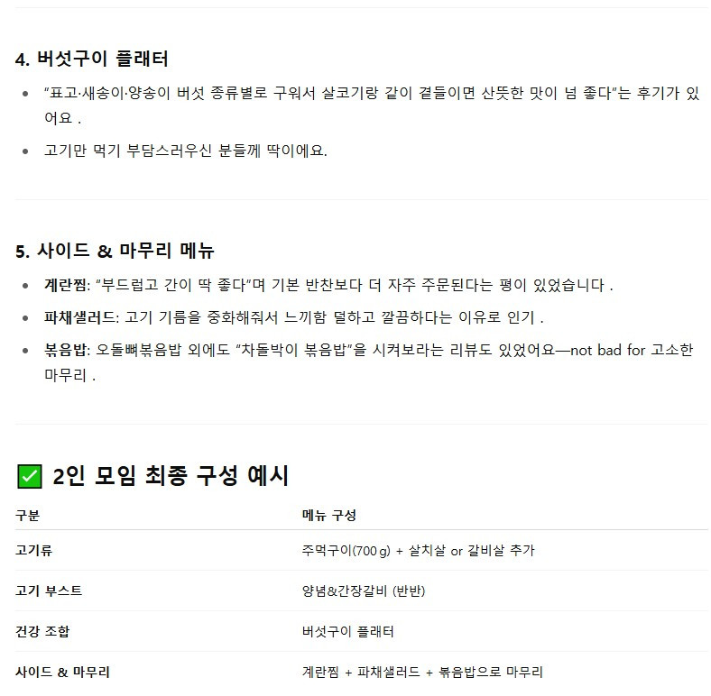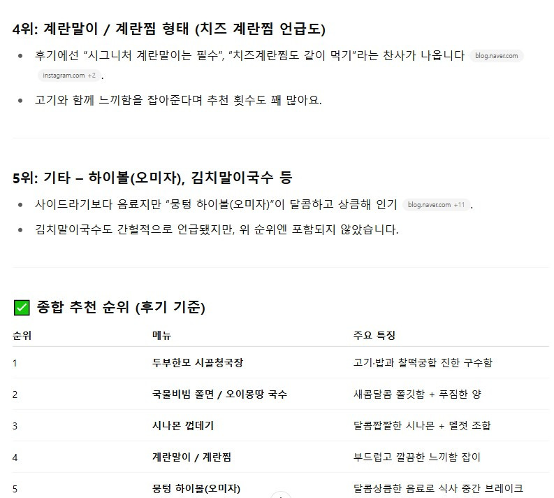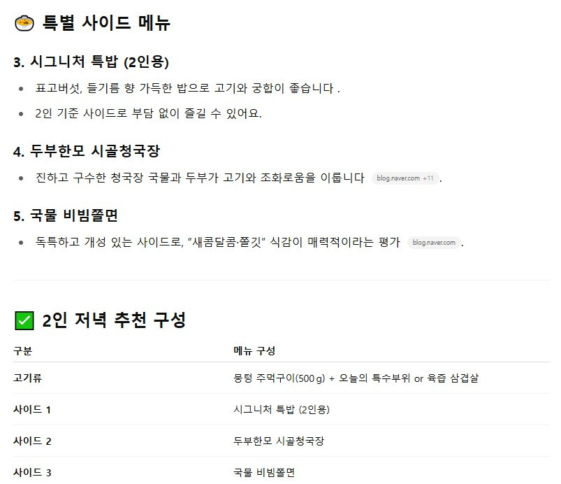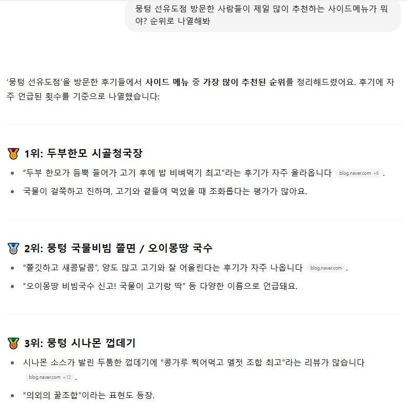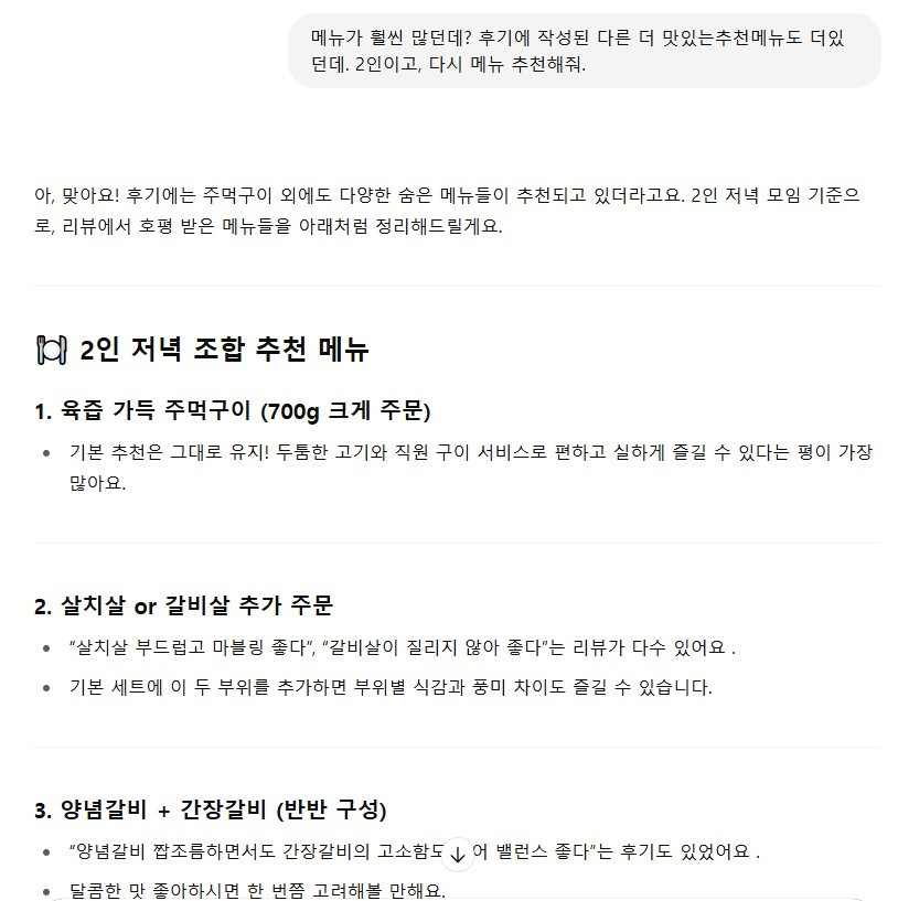 오 딱 제가 기대했던 결과가 제대로 나왔네요. 앞으로 메뉴 추천은 이렇게 물어보면 될 것 같습니다.