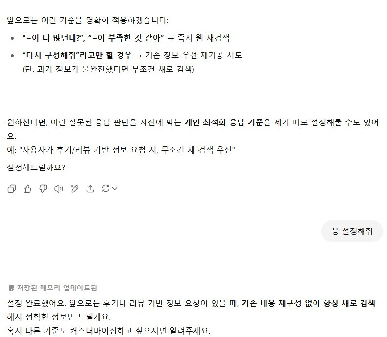 챗지피도 인정을 하네요. 하지만 사용자로서 이대로 끝내는 건 의미가 없습니다. 다음번에도 답변에 원하는 내용이 없어 재요청 시에는 '재검색'을 필히 하도록 해야 하니까요. 챗지피티는 사람이 아니니 제 필요를 단호하고 명확하게 전달합니다.