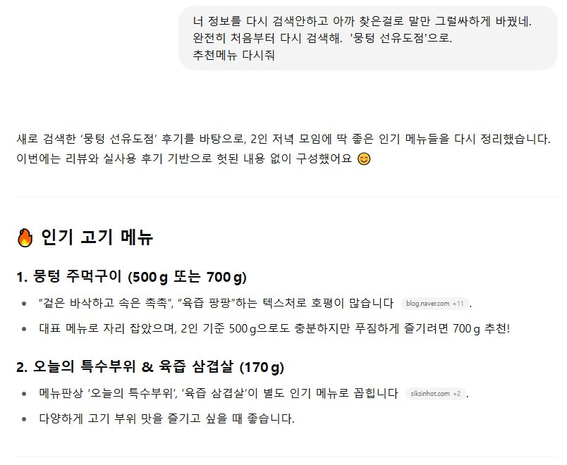 보통 외부에서 정보를 '검색'해서 가져올 때는 '검색 중'이라는 텍스트가 뜨면서 3~5초가량의 로딩 시간이 있는데 위에서 '다시 추천해 줘'라고 했을 때 검색 없이 0.5초 만에 바로 답변을 쓰기 시작하더라구요.