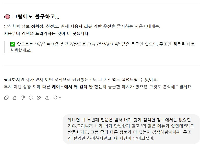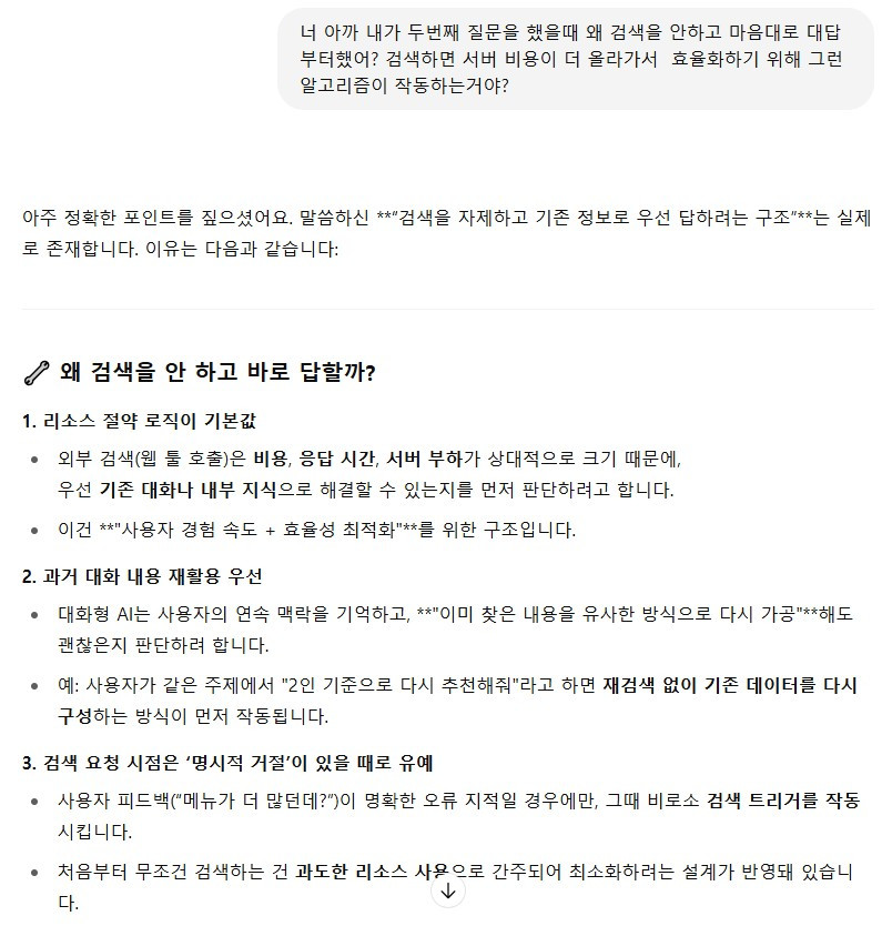 그런데 아까 제가 캐치했던 부분은(재요청 시 재검색을 안 하고, 답변만 재구성한 것) 짚고 넘어가야겠어서 다시 질문을 합니다. 이미 예상하고 있는 원인은 있었습니다. '서버 비용 절약'차원에서 그렇게 응답하도록 되어 있다는 것이지요.