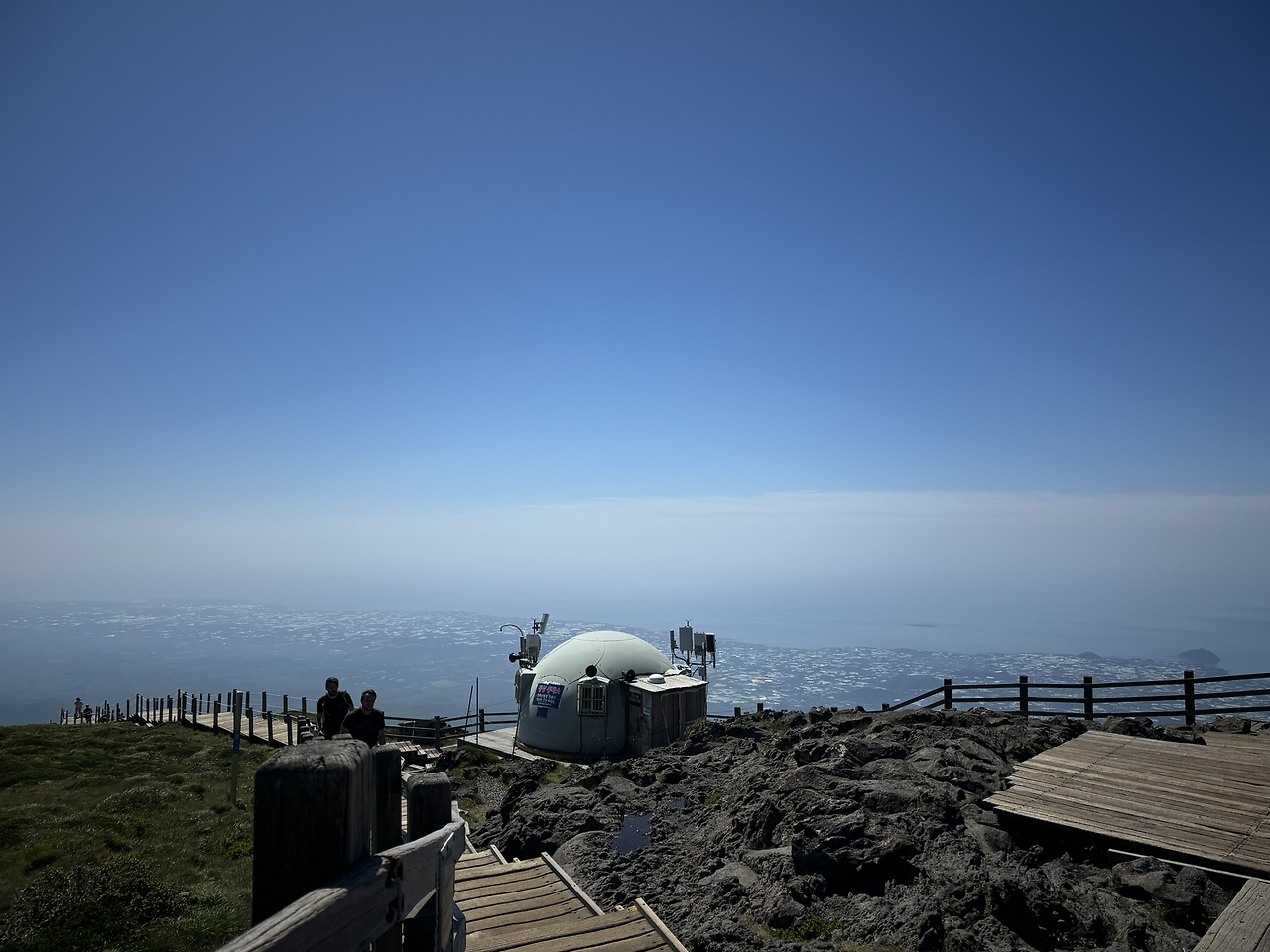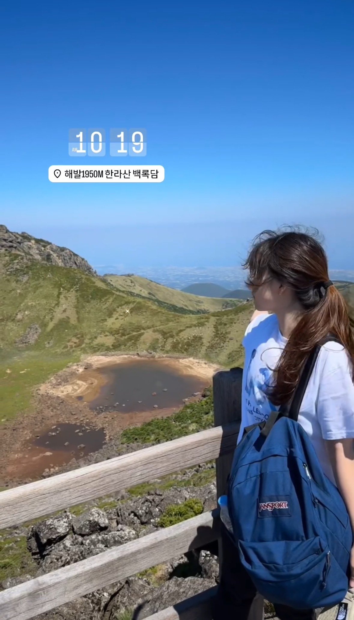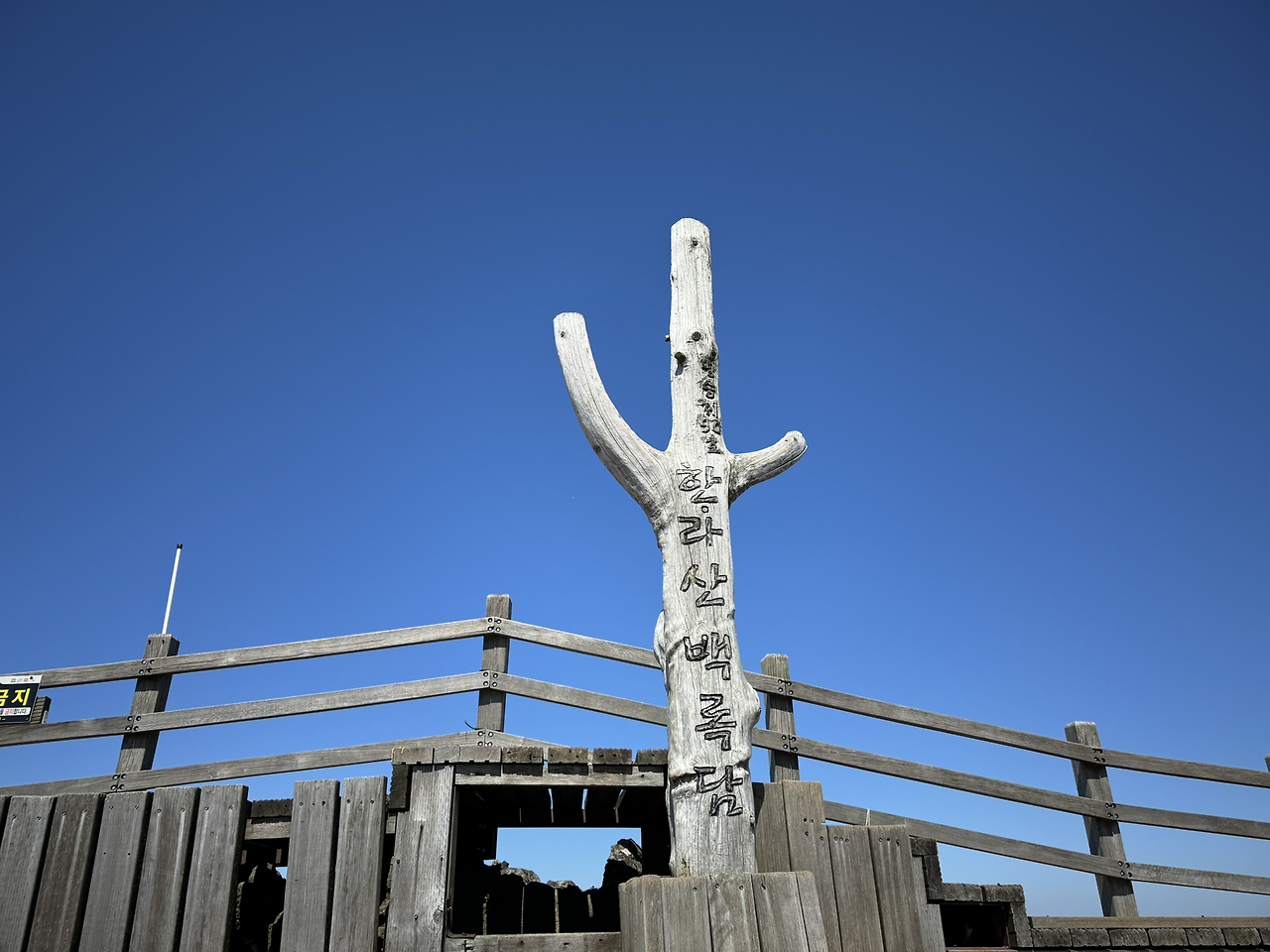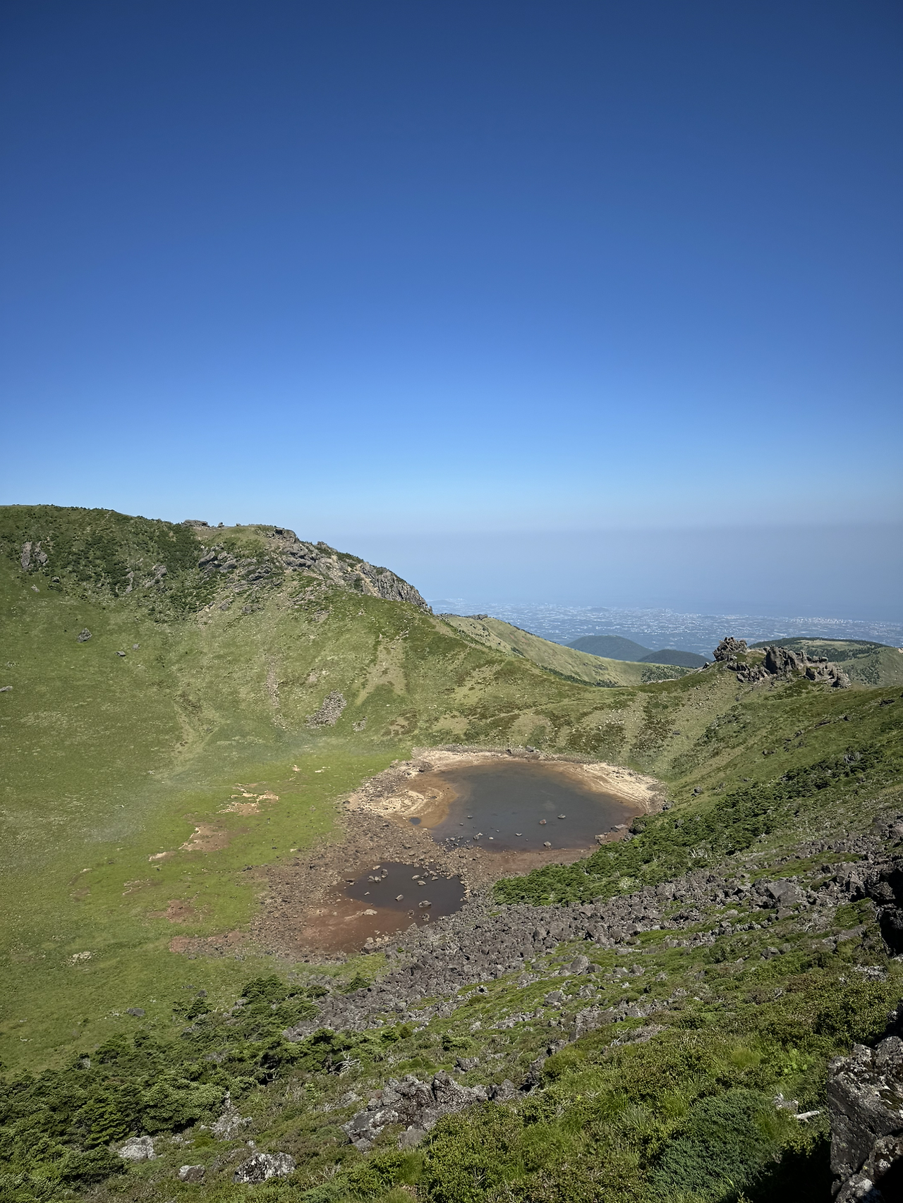 점점 거세지는 바람을 거슬러 정상에 진입했다. 한숨 돌리며 앉은 사람들을 지나 울타리 너머 물이 약간 고인 백록담이 보였다. 감상에 젖을 새도 없이 사납게 불어오는 바람에 눈뜨기도 힘든 와중에 혼자서 사진을 찍어보려다가 경치 감상하던 분께 사진 부탁을 드렸다. 이어서 내가 찍어드린다고 하자 이미 찍었다며 한사코 사양을 하시기에 감사하고 죄송한 마음이 들어 나의 비상식량 일부인 에너지바와 소시지를 나눠 드렸다. 30분 이상 줄 서야 찍는 비석 앞 인증샷은 패스했다.