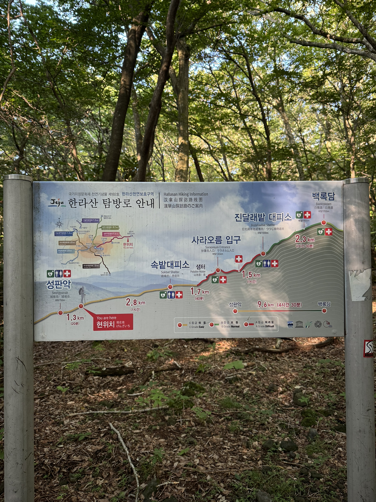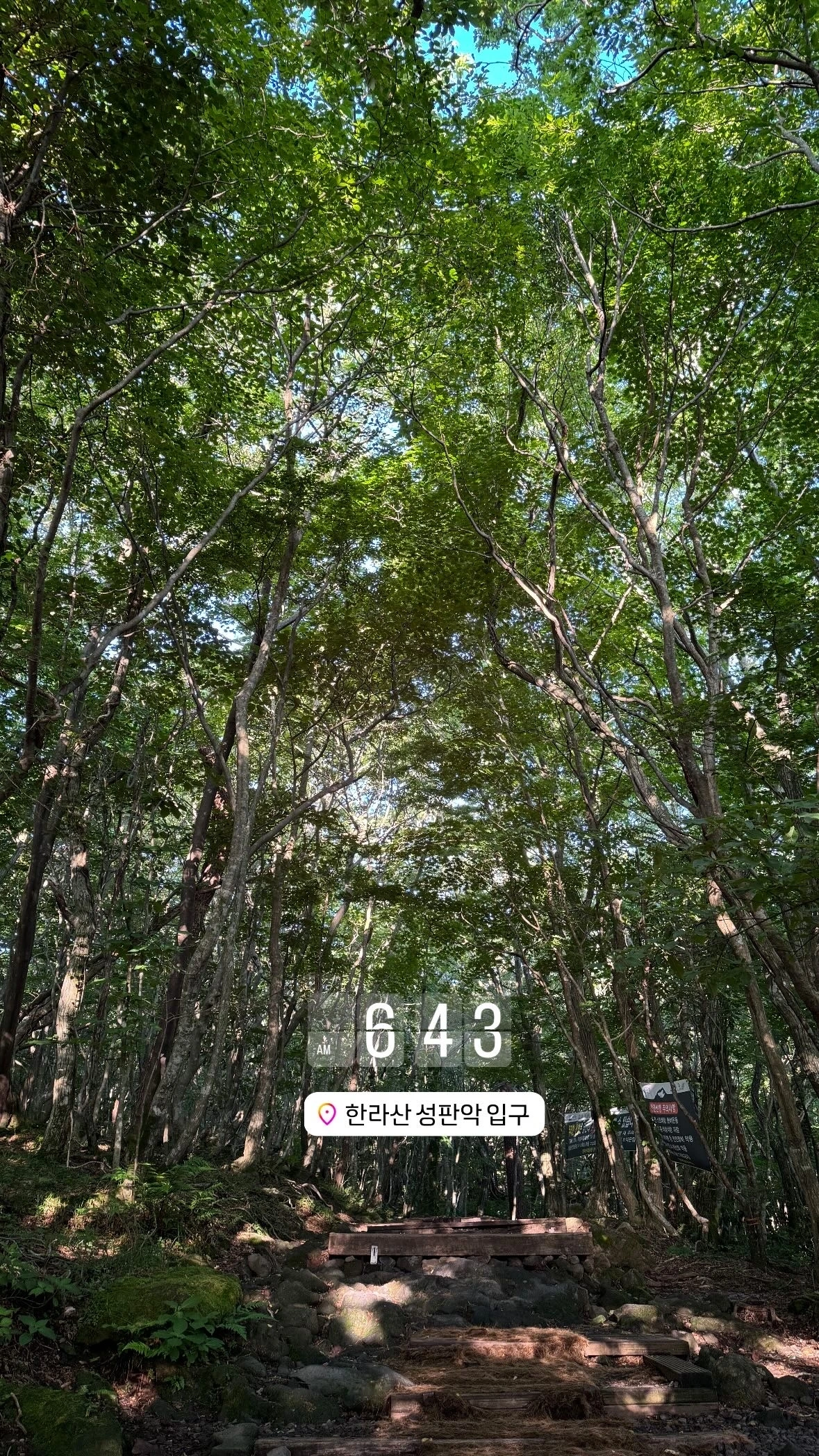 성판악 탐방로는 거의 정상을 바라보고 가는 코스나 다름없다 보니 초반에 좀처럼 달라지지 않는 풍경으로 다소 지루한 산행이 될 수도 있다. 다행히 초록잎이 무성한 시즌이고, 날이 좋아 오르는 내내 나무 그림자와 돌 사이사이로 햇살이 아른거려 반짝이는 모습이 예쁘게 이어져 좋았다.