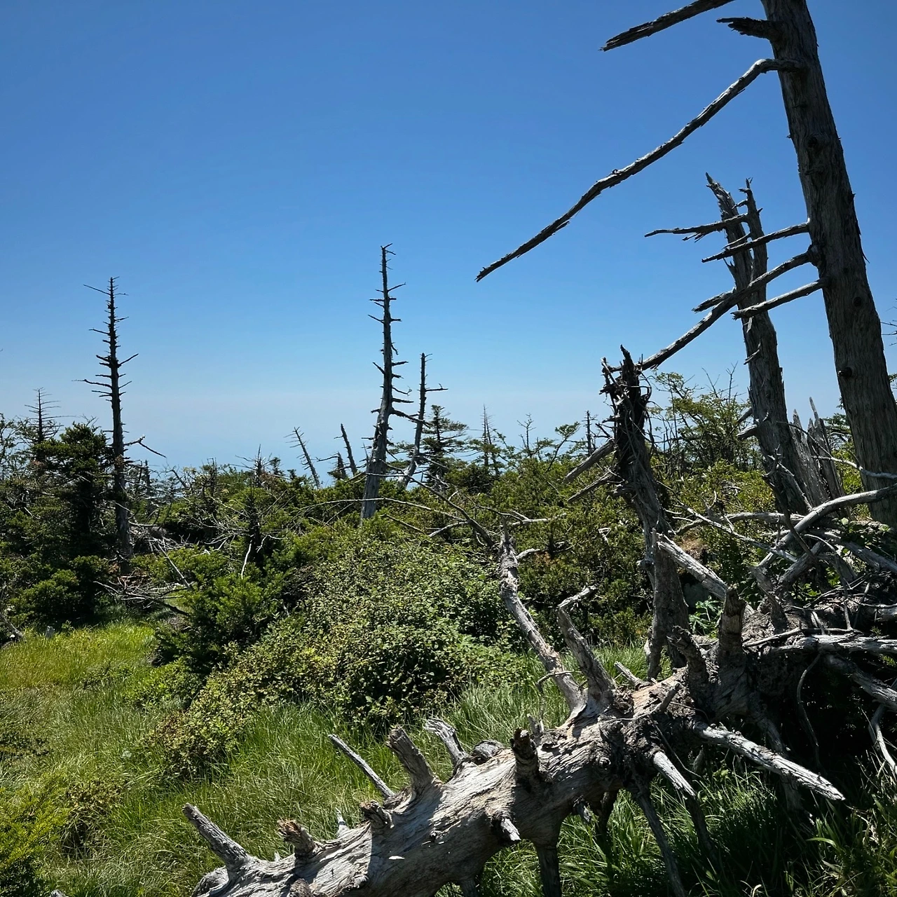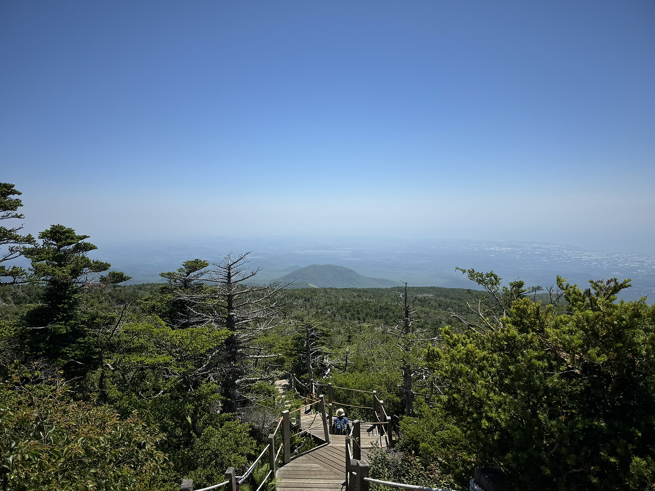 진달래 대피소를 지나고 오래지 않아 완전히 다른 풍경이 펼쳐졌다. SF영화에서나 볼 법한, 죽어서도 천 년이 간다는 멋진 주목나무와 구상나무 숲이 등장하며 시야가 탁 트이기 시작했다. 동시에 바람도 세졌다. 여기서부터 정상까지 조금만 더 가면 되는데 그 길이 가장 난코스였다. 그래도 날이 좋아 파란 하늘 아래 멀리 바다와 오름이 보였고 그 아래 넓고 높은 어딘가에 내가 서 있다는 사실이 좋았다. 몇 걸음마다 돌아보지 않을 수 없는 풍경이었다.