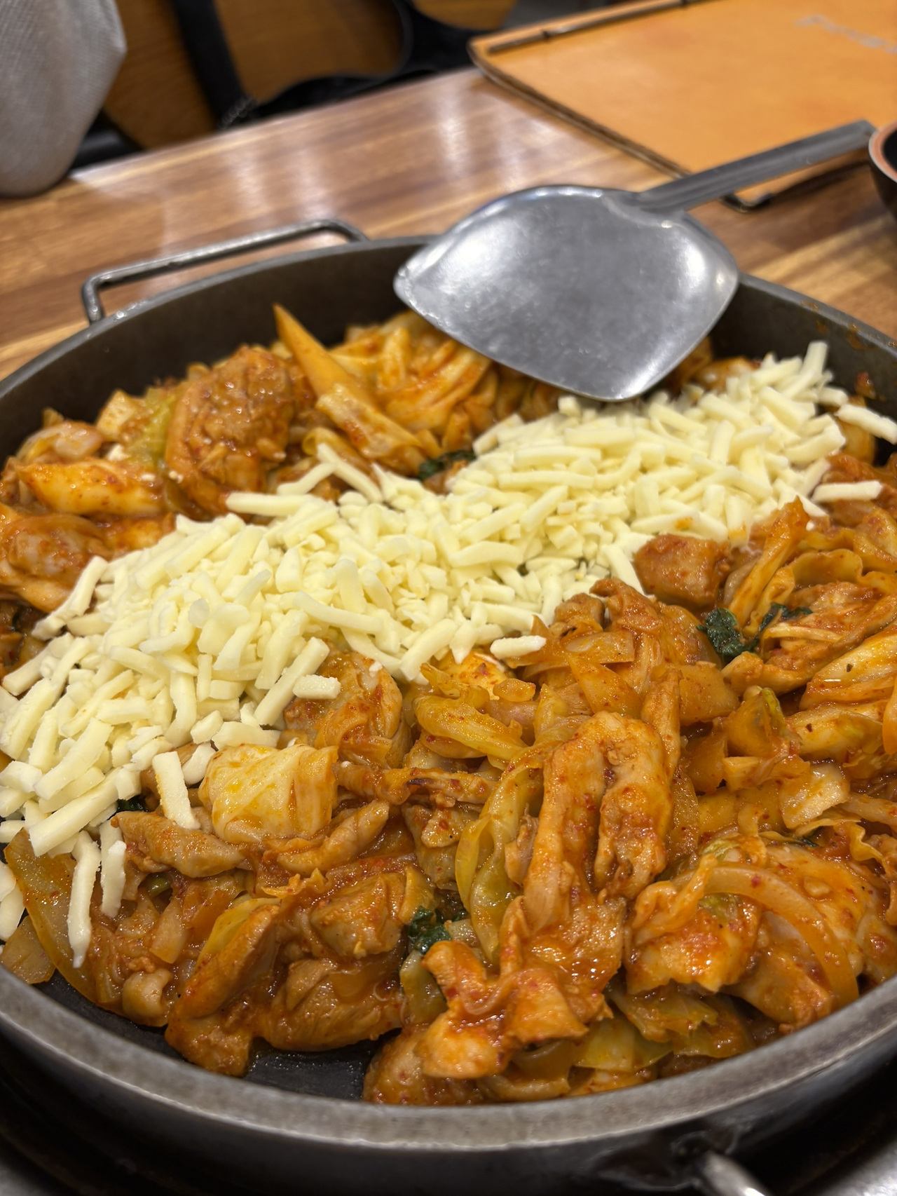 고민하다 닭갈비를 먹으러 가기로 했다. 메뉴판을 보는 순간에도 친구는 입맛이 없다는 말만 반복했다. 난 매운걸 먹을 수 없으니 치즈 닭갈비를 먹기로 했다. 다른 것 추가하지 않고 딱 치즈 닭갈비 2인분!!으로 정했다. 난 배가 고팠던 지라 닭갈비가 빨리 나오길 기다리며 친구의 동그란 물티슈에 물을 부어주었다. 치즈 닭갈비가 나오고 거의 익었으니 치즈가 조금 녹으면 먹으라는 직원의 말이 들렸다.