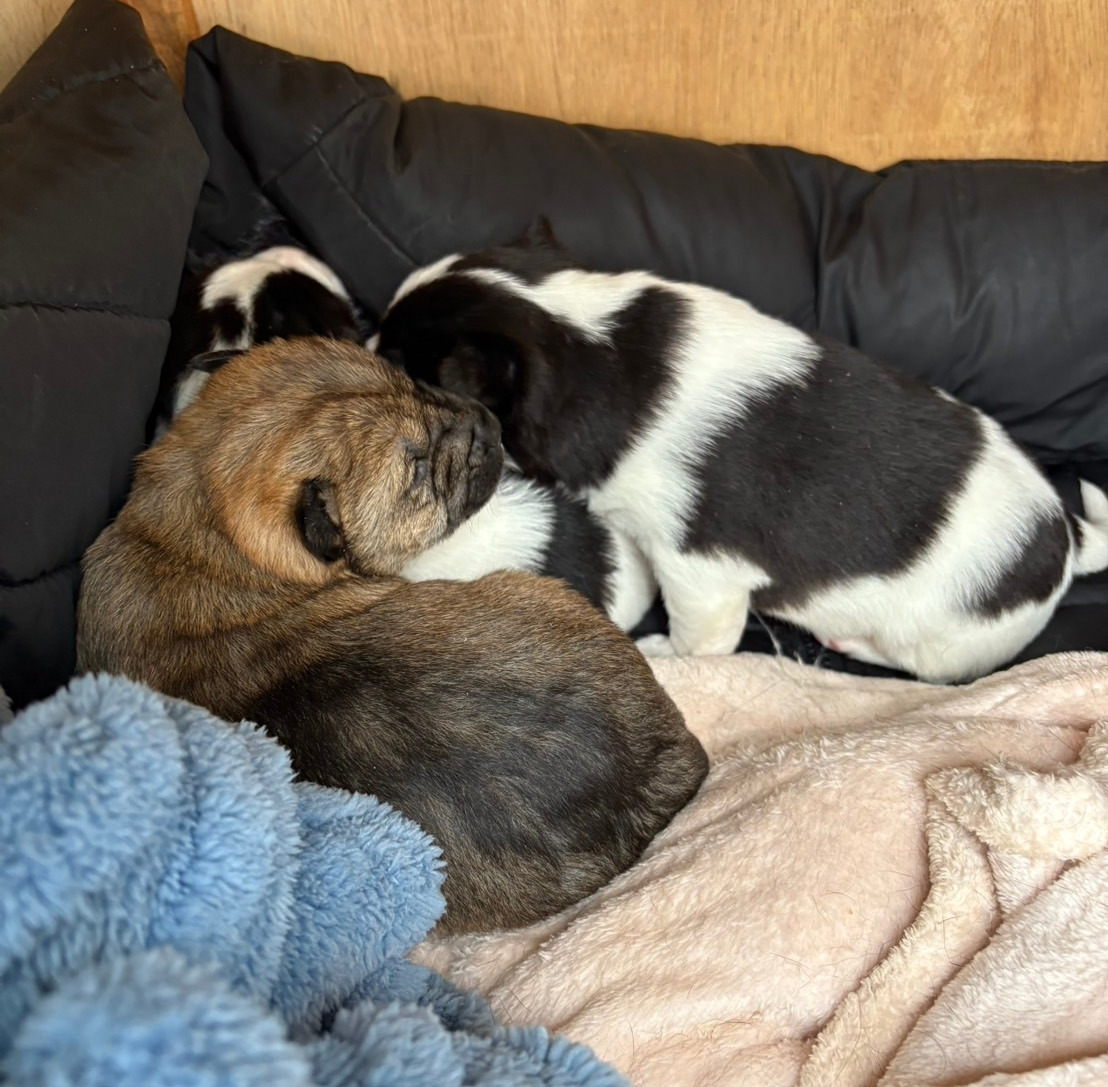 따뜻해 보이는 담요들 사이로 파고드는 귀여운 새끼 강아지 세 마리가 보였다.